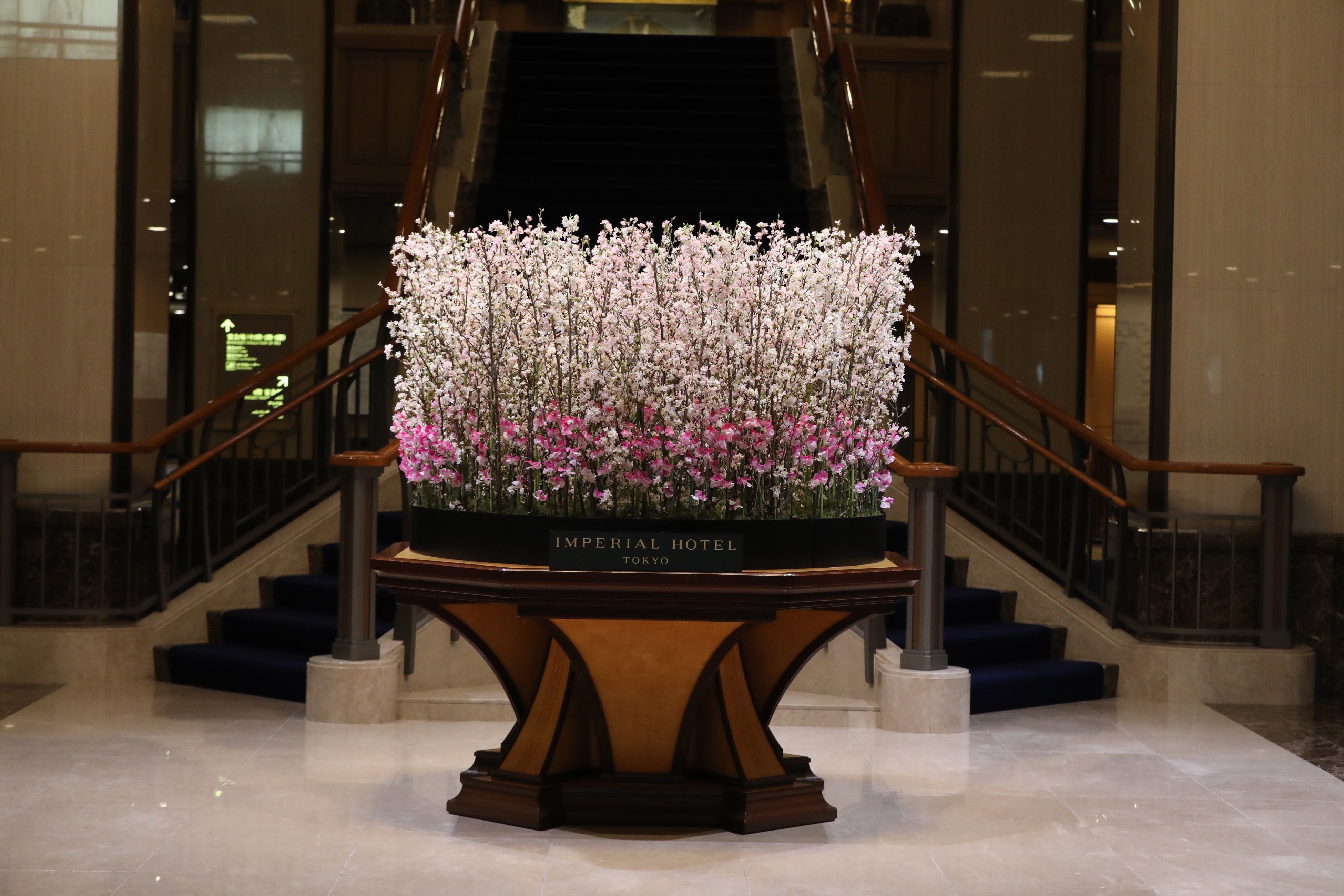 帝国ホテル 東京1階メインロビーでは、中央の桜の花が皆さまをお迎えします。また、みゆき通り花壇では、期間限定でこの時期ならではの春らしい花々をお楽しみいただけます。