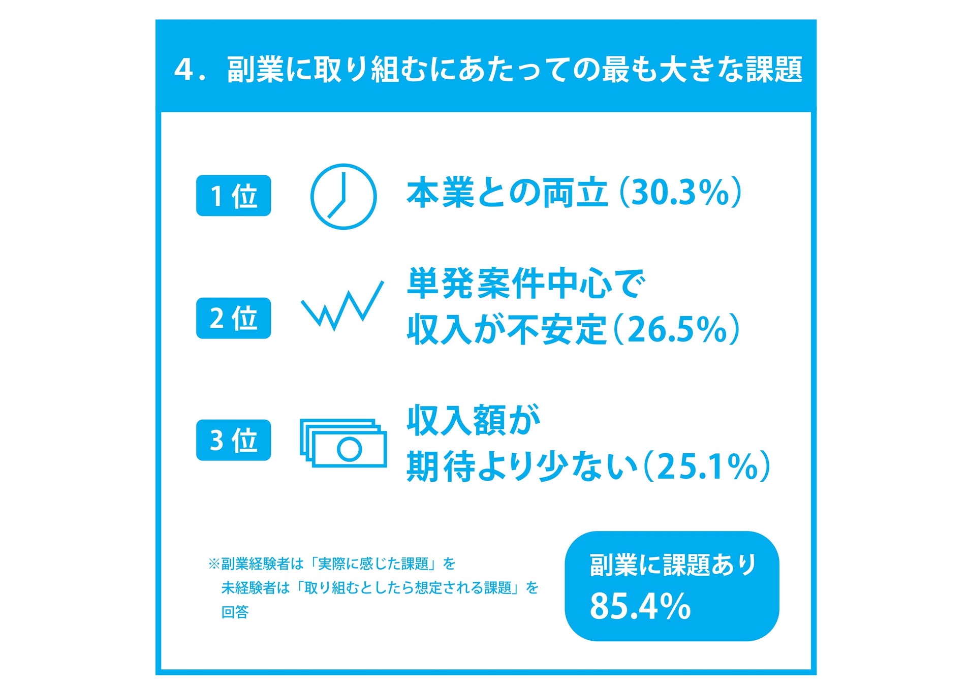 ・「85.4%が副業を取り組むにあたり何らかの課題あり。TOP3位は、1位『収入の継続性よりも本業との両立が課題』、2位『単発案件中心で収入が不安定』、3位『収入額が期待より少ない』」