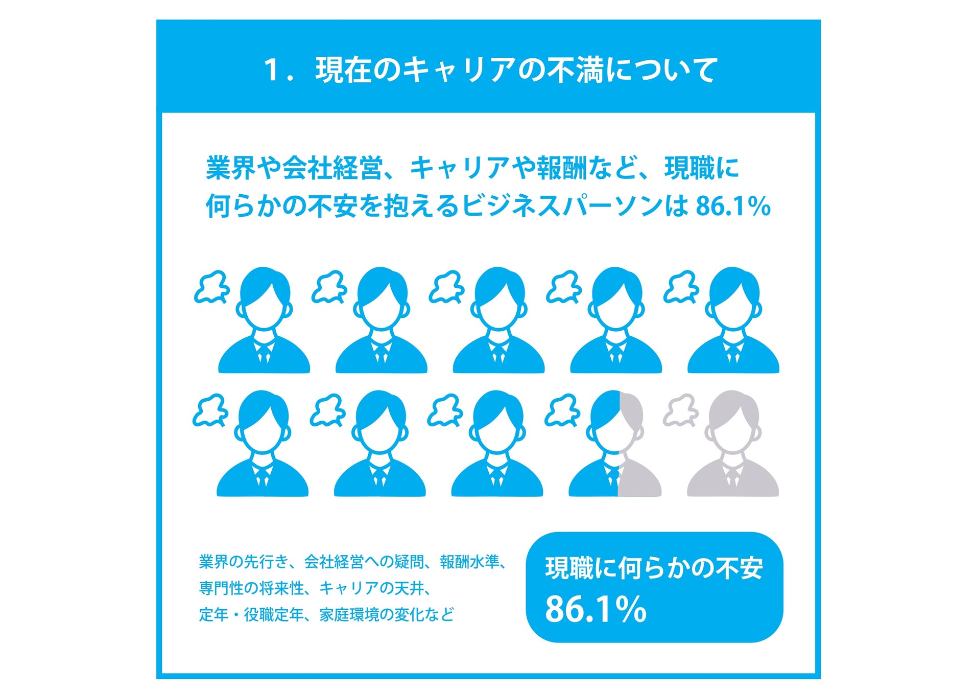 ・「86.1%が現職に不安あり。3人に1人が業務内容に不満を抱え、最も不満を持つ層は40~44歳。」