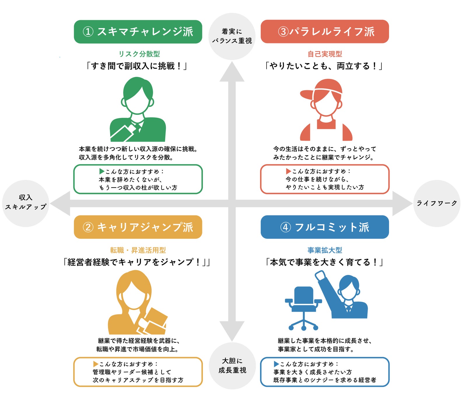 本プロジェクト では継業キャリアを検討する人々の動機や目的を分析し、4つのタイプに分類しました。「自分はどのタイプ?」を知ることで、最適な継業スタイルを見つけられます。