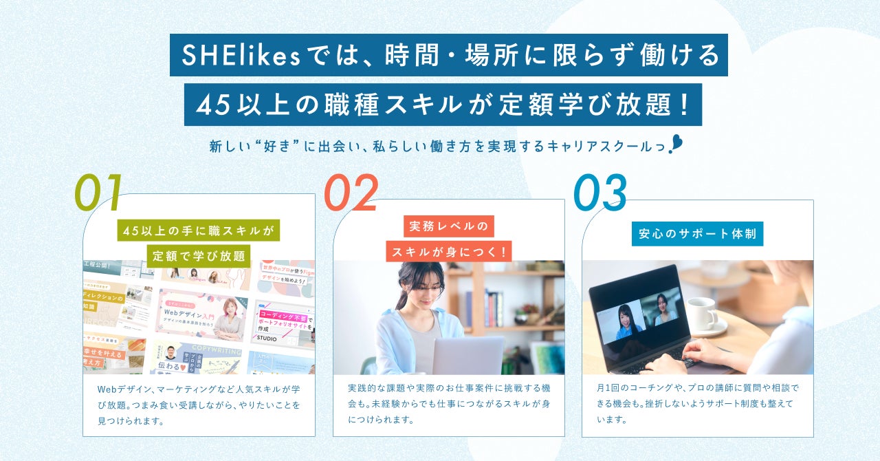 SHElikesは、時間や場所にとらわれずに働ける45以上の職種スキルが定額で学び放題の女性向けキャリアスクールです。Webデザイン・Webマーケティング・ライティングなどPCひとつで働けるデジタルスキル、クリエイティブスキルを幅広く学ぶことで、私らしい働き方の実現に伴走します。