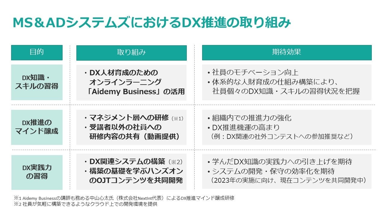 MS&ADインシュランス グループのMS&ADシステムズ株式会社(社長:津田卓也)と株式会社アイデミー(社長CEO:石川聡彦)は、MS&ADシステムズのDXを共に推進していくパートナーとして本格的に協業し、MS&ADシステムズ社内のDX推進能力の向上を目指します。