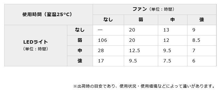 最大運転時間は20時間(Wind GEAR14、弱風量での連続使用時間)。