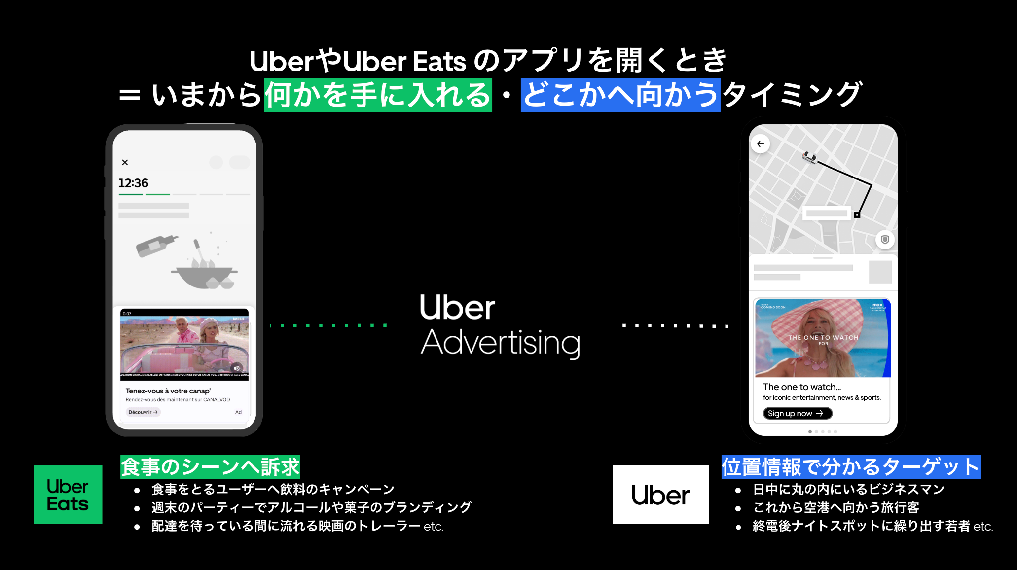 Uber広告は、配車サービス「Uber」やデリバリーサービス「Uber Eats」のアプリ内に出稿できる広告ソリューションです。