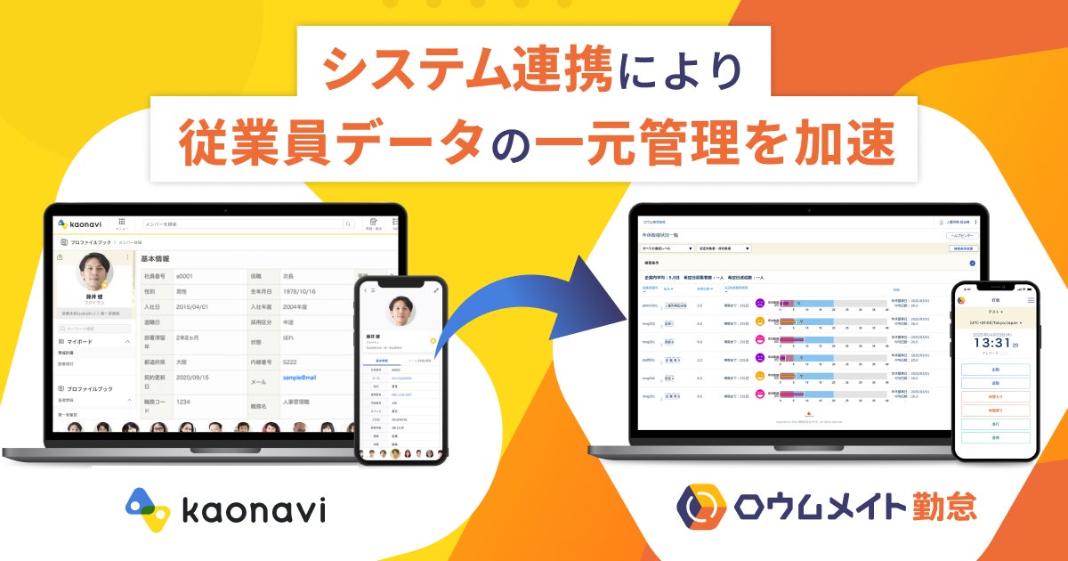 株式会社カオナビ(本社:東京都渋谷区、代表取締役社長CEO:佐藤 寛之、以下:当社)が提供するタレントマネジメントシステム「カオナビ」と、勤怠管理システム「ロウムメイト勤怠」との連携を開始しました。今回の連携により、「カオナビ」に登録されている従業員データが「ロウムメイト勤怠」で確認できるようになり、入退社や異動などに伴う従業員データの更新作業の負担を軽減します。