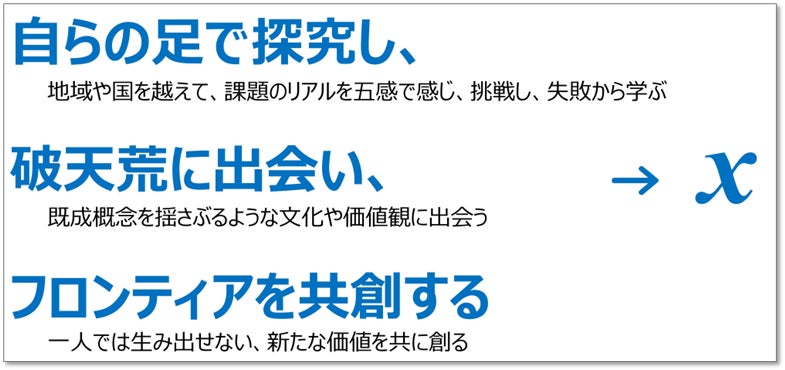 ■ドルトンX学園高等学校の特長~米国ミネルバ大学を参考とした地域拠点学習~<めざす学生像:「自らの足で探究し、破天荒に出会い、フロンティアを共創する」姿>