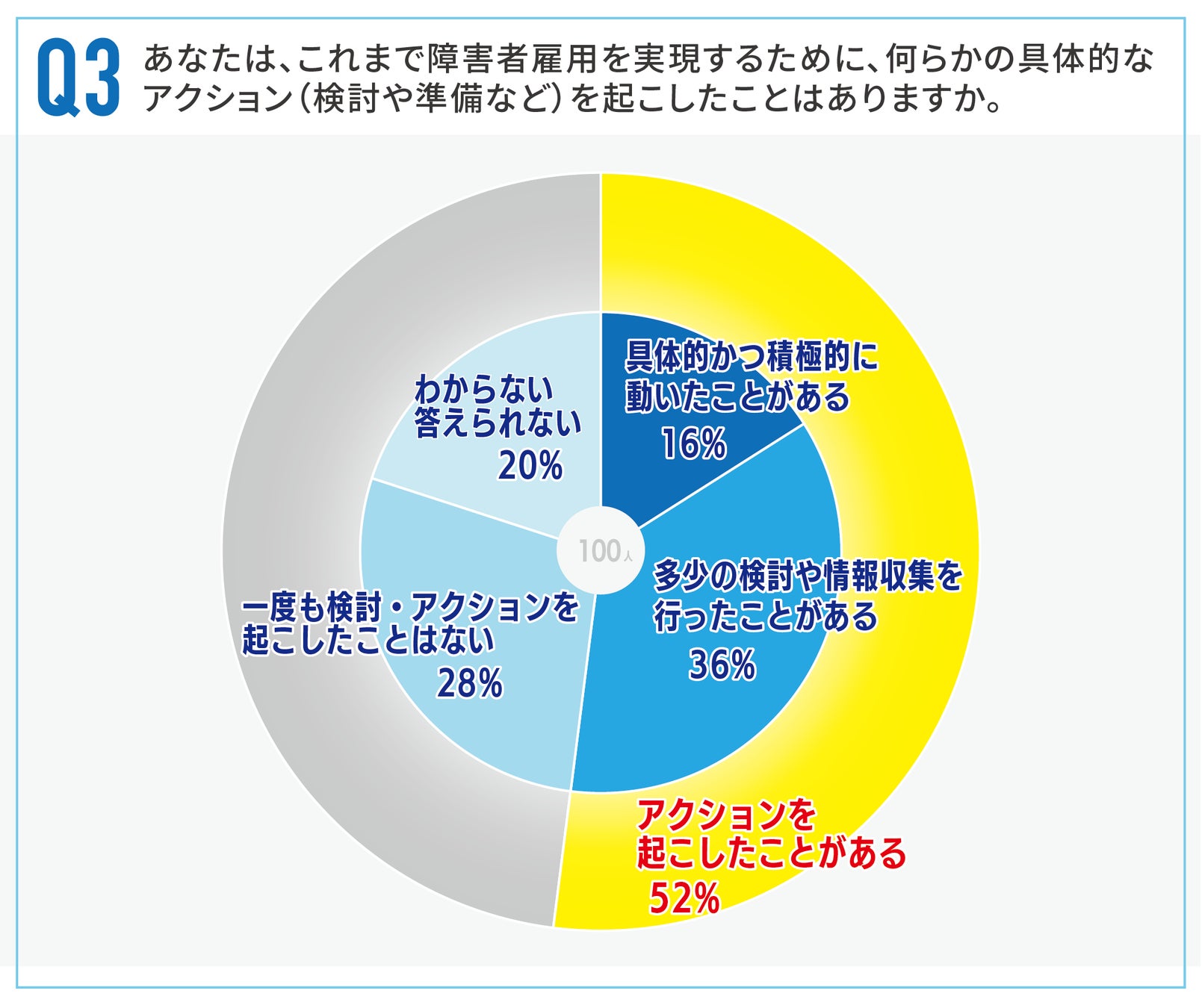 「障害者雇用を実現するために具体的な行動(検討や準備など)をしたことはありますか。」と伺うと52%が「ある」と回答。すでに調査・情報収集・検討などの行動を始めている担当者が多い一方、“次のステップ”に進めていないケースが多いことがうかがえます。