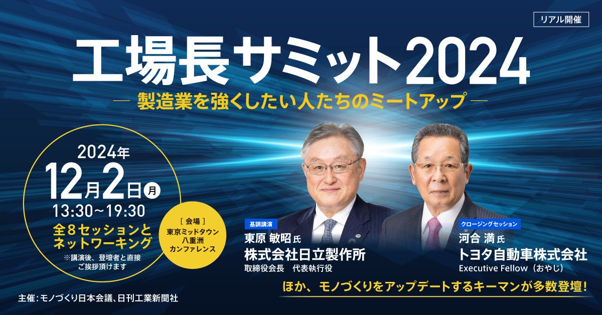 モノづくり日本会議と日刊工業新聞社は12月2日(月)に東京ミッドタウン八重洲(東京都中央区)で、モノづくり関連企業のキーマンが集まるビジネスカンファレンス「工場長サミット2024 ー製造業を強くしたい人たちのミートアップー」を開催します。日立製作所の東原敏昭会長の基調講演を始め9つのセッションは、製造業にとって注目度の高いテーマを選び、約20名のキーマンに登壇して頂きます。講演を起点にネットワーキングを通じて参加者(登壇者・聴講者)がさまざまな課題を共有認知する場を作り、業界や企業の枠を超え、未来志向で日本の強みである製造業の底上げを目指します。