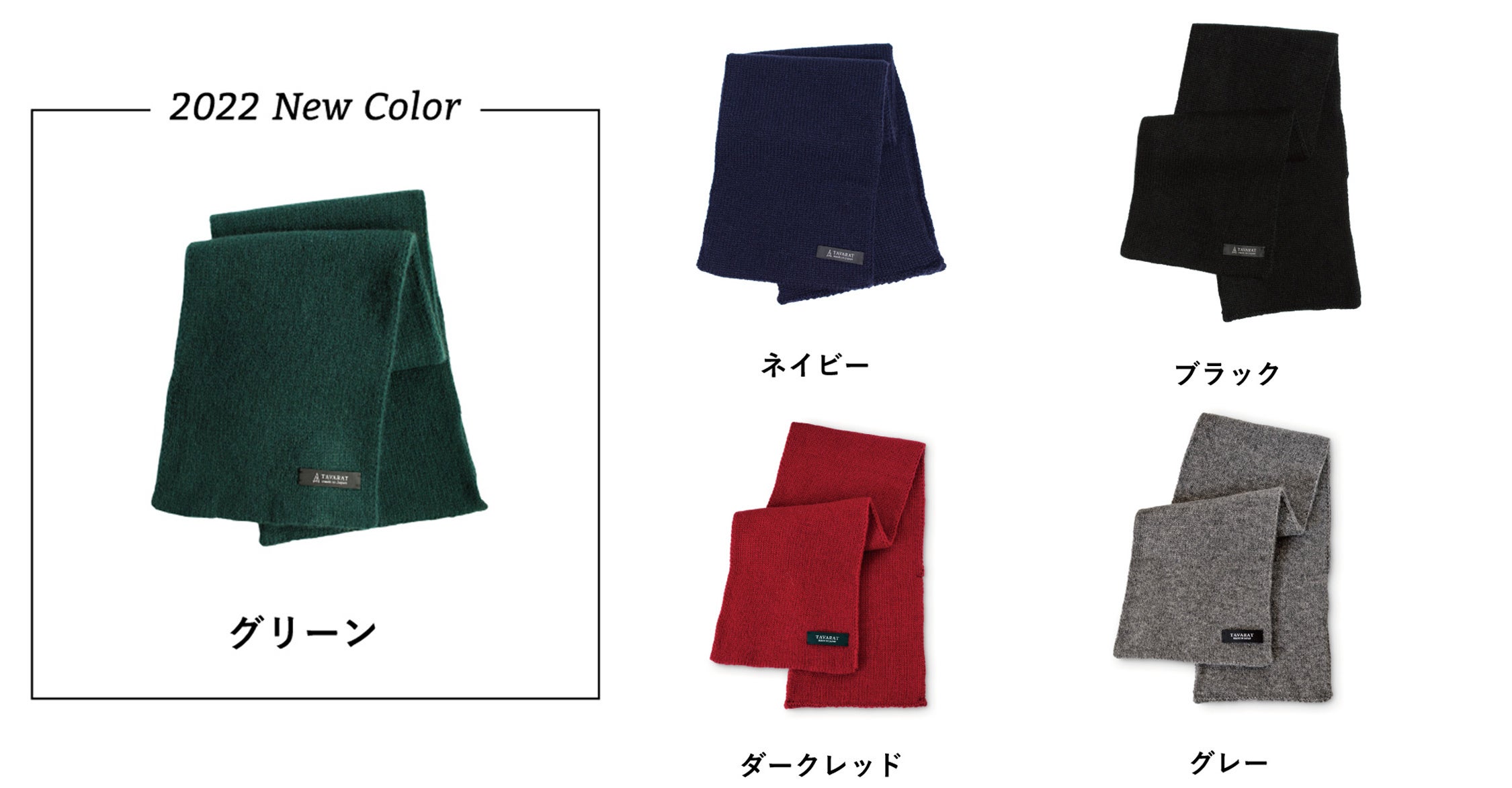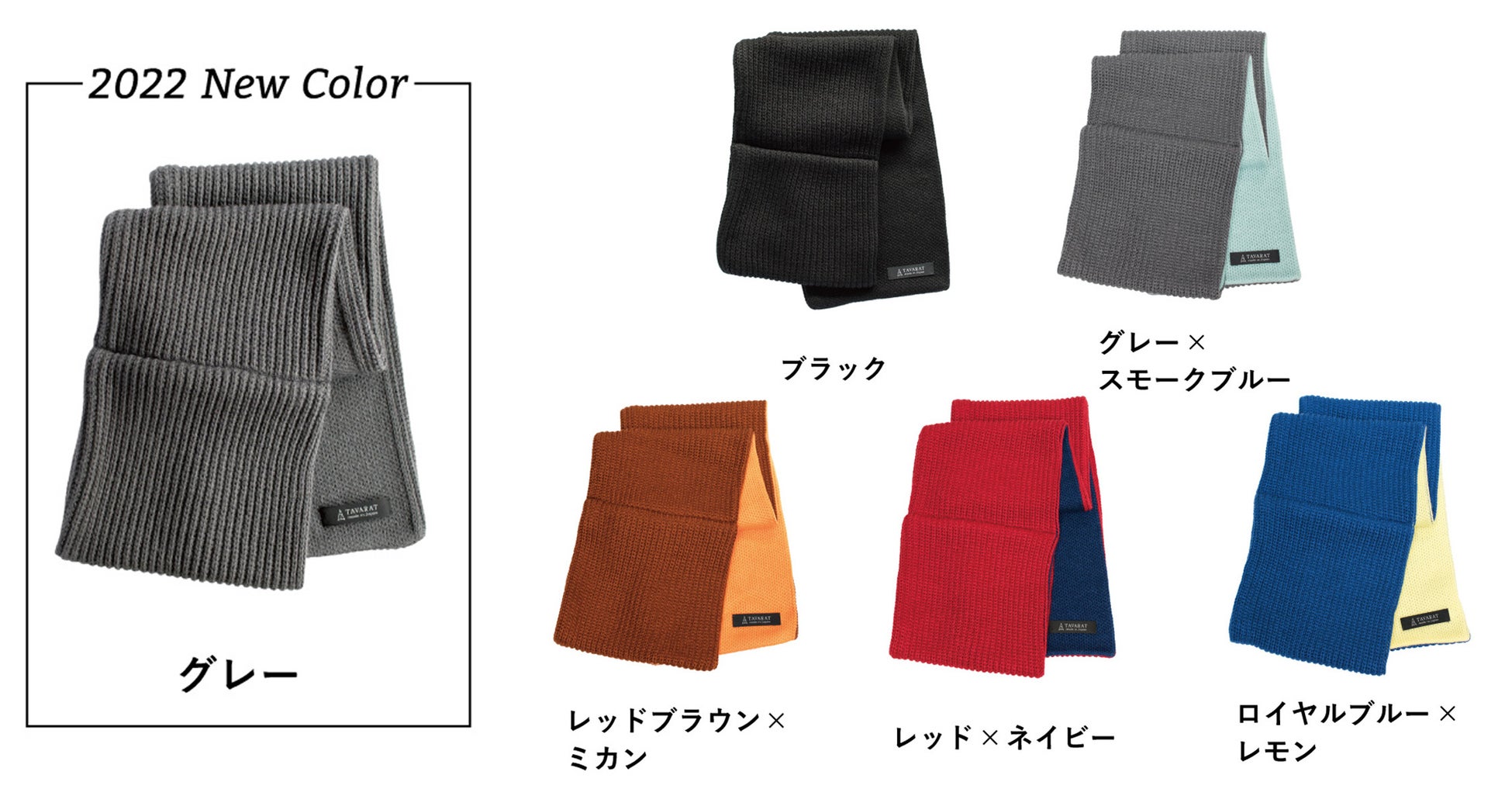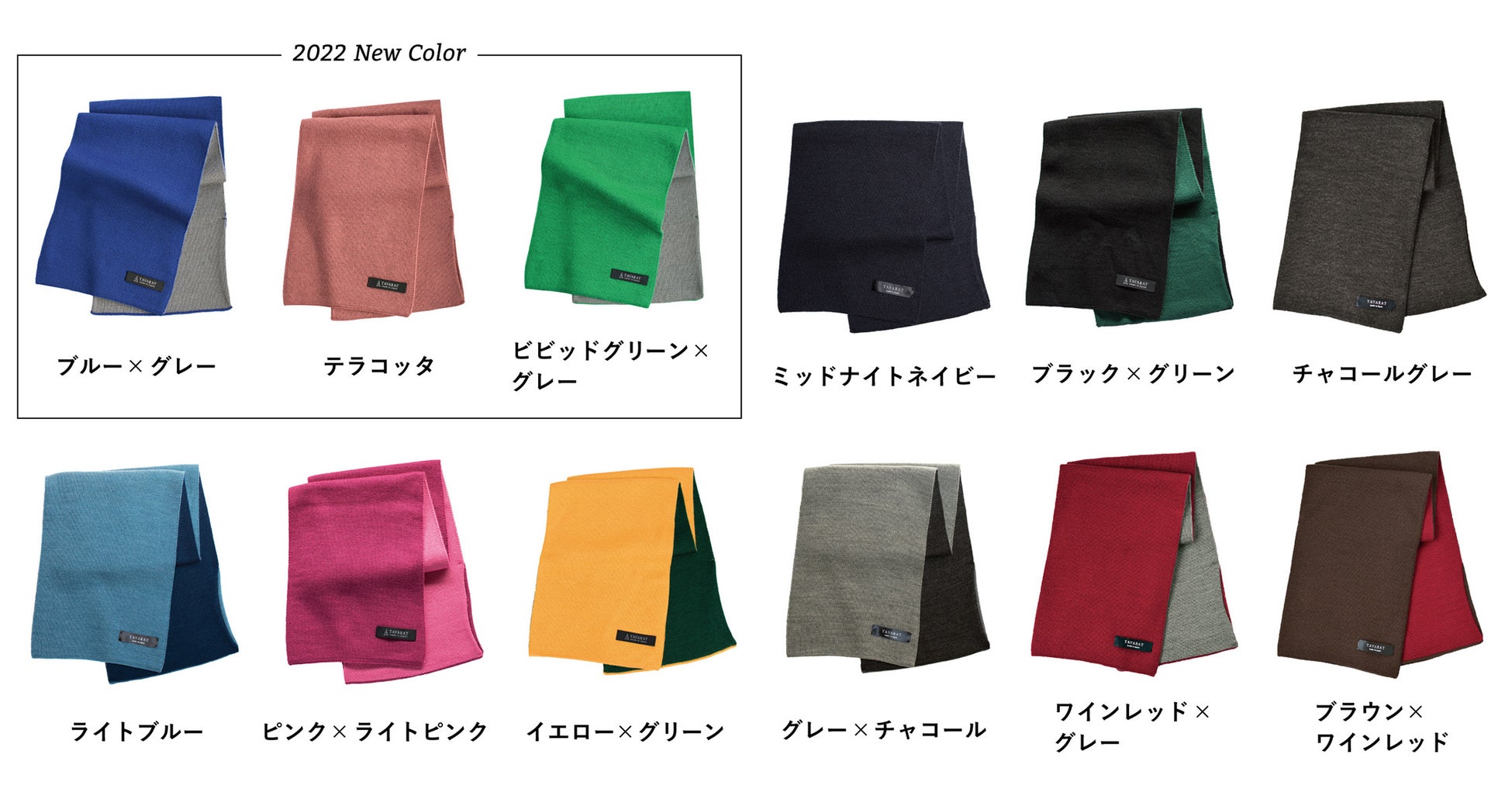 2022年冬、ブルー×グレー・テラコッタ・ビビットグリーン×グレーが加わり、「3秒マフラー」は全12色展開となりました。今回の新色は冬服の差し色としてカジュアルにお使いいただける色となっています。
