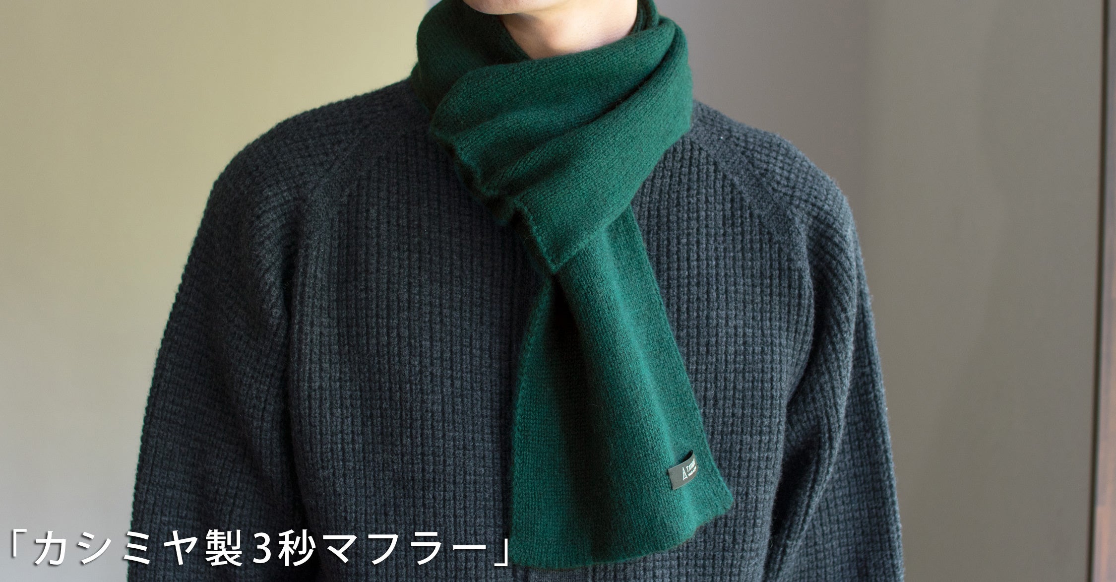 「カシミヤ製3秒マフラー」には新たにグリーンが加わり、全5色展開となりました。深い緑は黒や紺などの濃い色にも、アイボリーやベージュなどの淡い色にも合わせやすく、迷わずにお使いいただけます。
