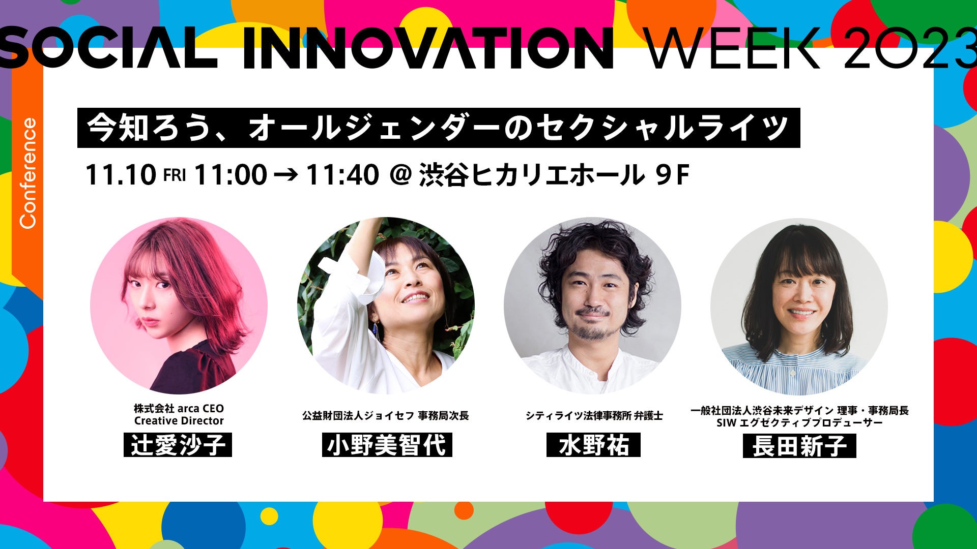 カンファレンスプログラムでは、「今知ろう、オールジェンダーのセクシャルライツ」と題し、SIWフェローでもある株式会社arca辻愛沙⼦さんと、WWAs実行委員の公益財団法人ジョイセフ小野美智代さん、そして弁護士の水野祐さんが登壇します。人権を無視した性被害、性犯罪、今年は日本のメディアでも多く目に・耳にする機会がありました。なぜこのような犯罪や被害は起こったのか。ダイバーシティを問うSIWという場で、改めてオールジェンダーにおけるセクシュアルライツについて深堀ります。