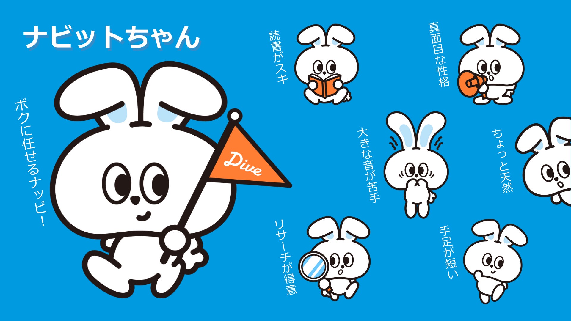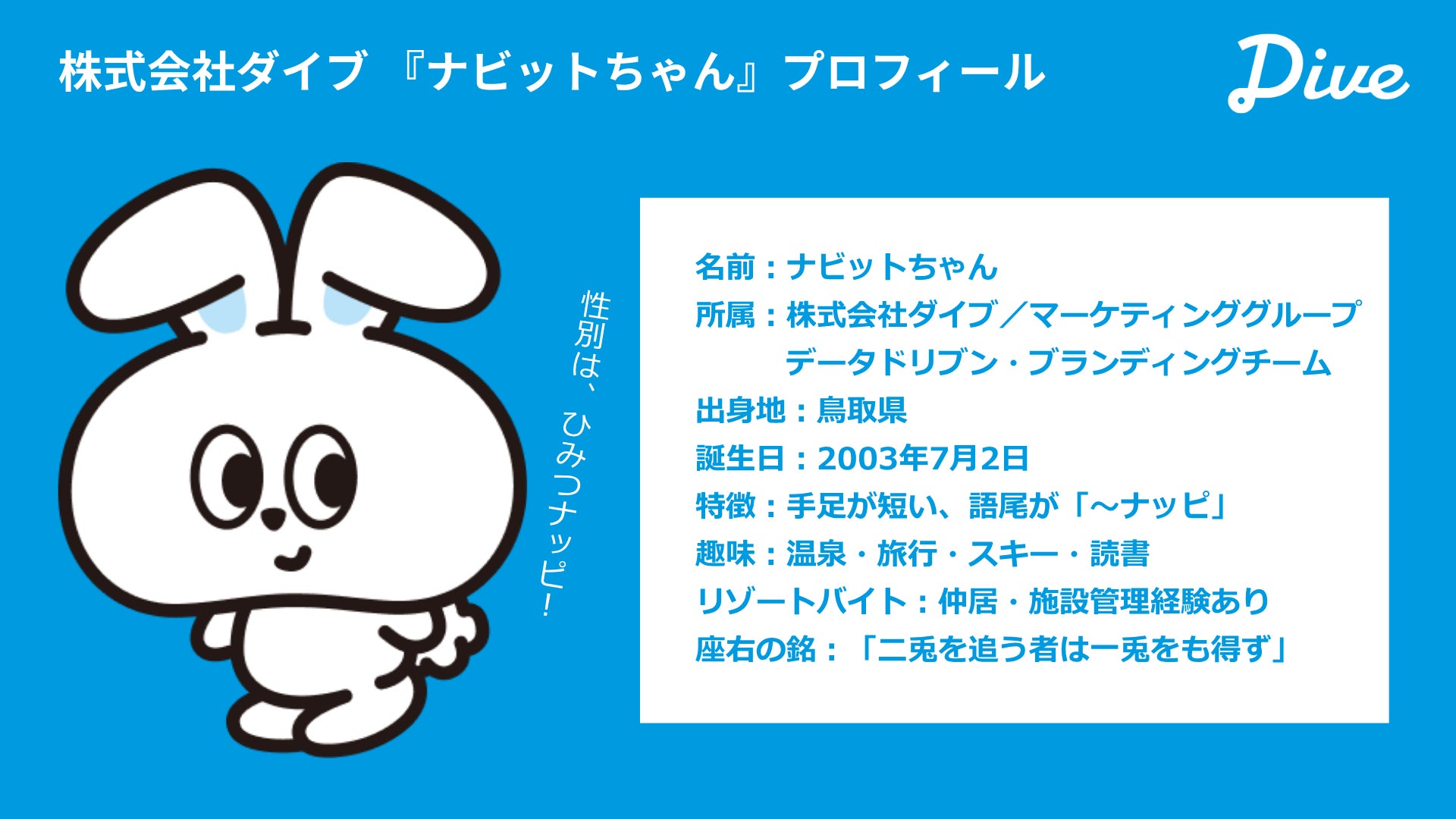 みなさんはじめまして。ボクはうさぎの ”ナビットちゃん”です。このたび、株式会社ダイブに入社しました!観光施設に特化した人材サービス『リゾートバイトダイブ』で、「X」を担当することになったナッピ!