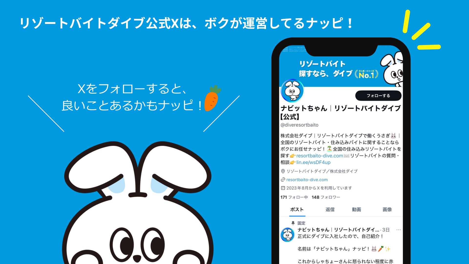 ボクが運営するリゾートバイトダイブ公式X(旧Twitter)では、ダイブのしゃちょーさんに怒られない程度にリゾートバイトに関連したおもしろネタを投稿していくから、ぜったいフォローしてナッピ!