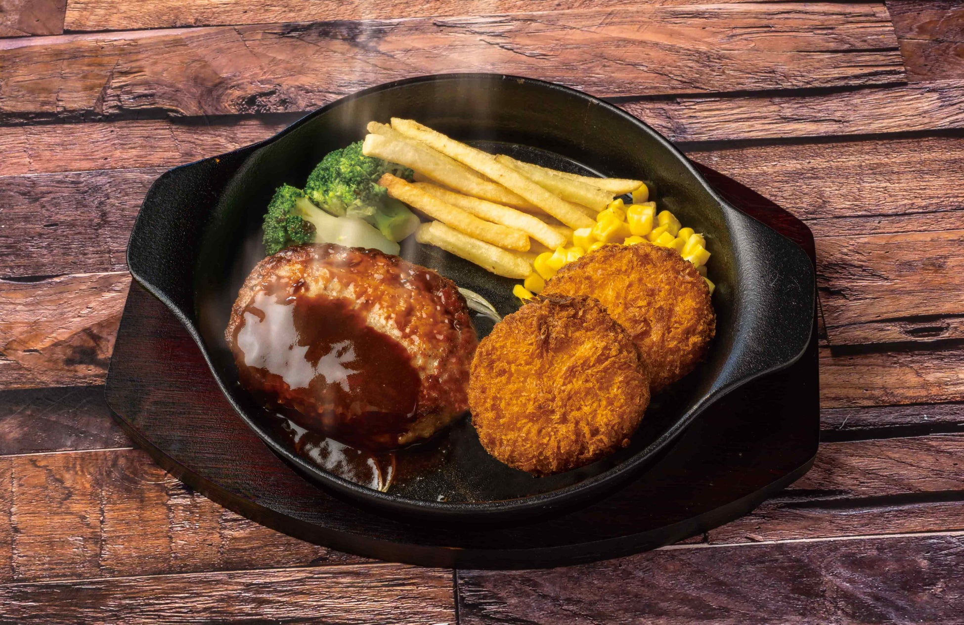 人気のオリジナルハンバーグとかにクリームコロッケが楽しめる夢のコラボメニュー。熱々ハンバーグにサクサクとろーりのかにクリームコロッケが堪りません。