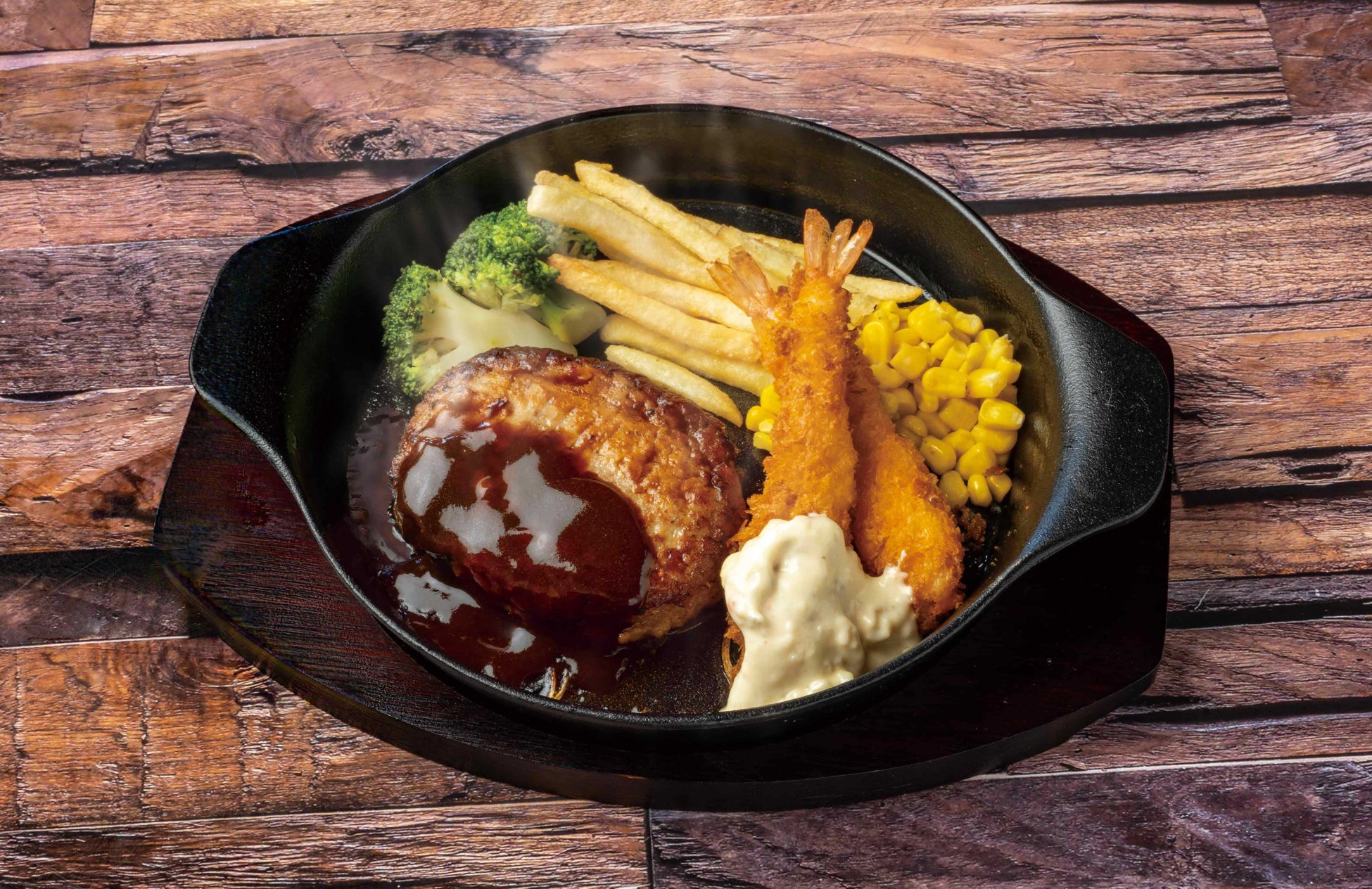 人気のオリジナルハンバーグとエビフライが楽しめる夢のコラボメニュー。熱々のハンバーグとタルタルソースたっぷりの香ばしいエビフライが楽しめる贅沢なひと皿です。