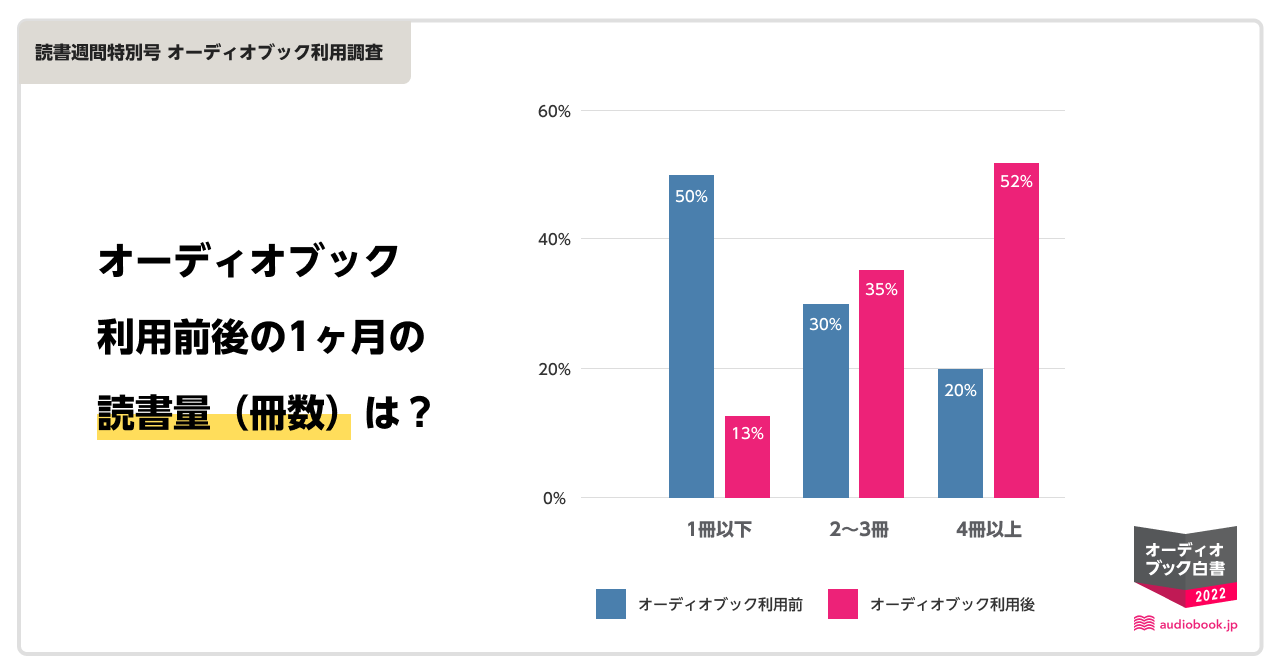 1ヶ月の読書量(冊数)を聞いたところ、オーディオブック利用前は1冊以下という人が半数(50%)でしたが、利用後は1冊以下が13%にまで減少。一方で4冊以上と答える人は半数以上(52%)という結果となりました。