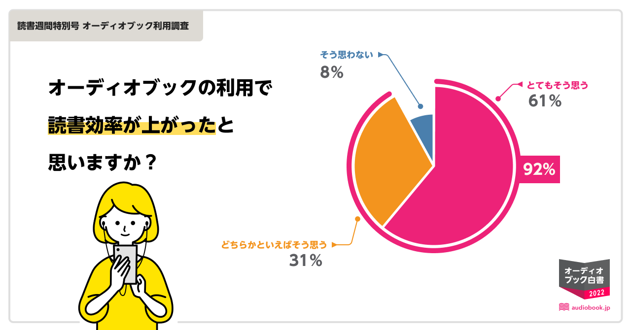 また、「オーディオブックの利用で読書効率が上がったと思うか」という質問では、92%もの人が「読書効率が上がった」(「とてもそう思う」「どちらかといえばそう思う」)と回答しました。
