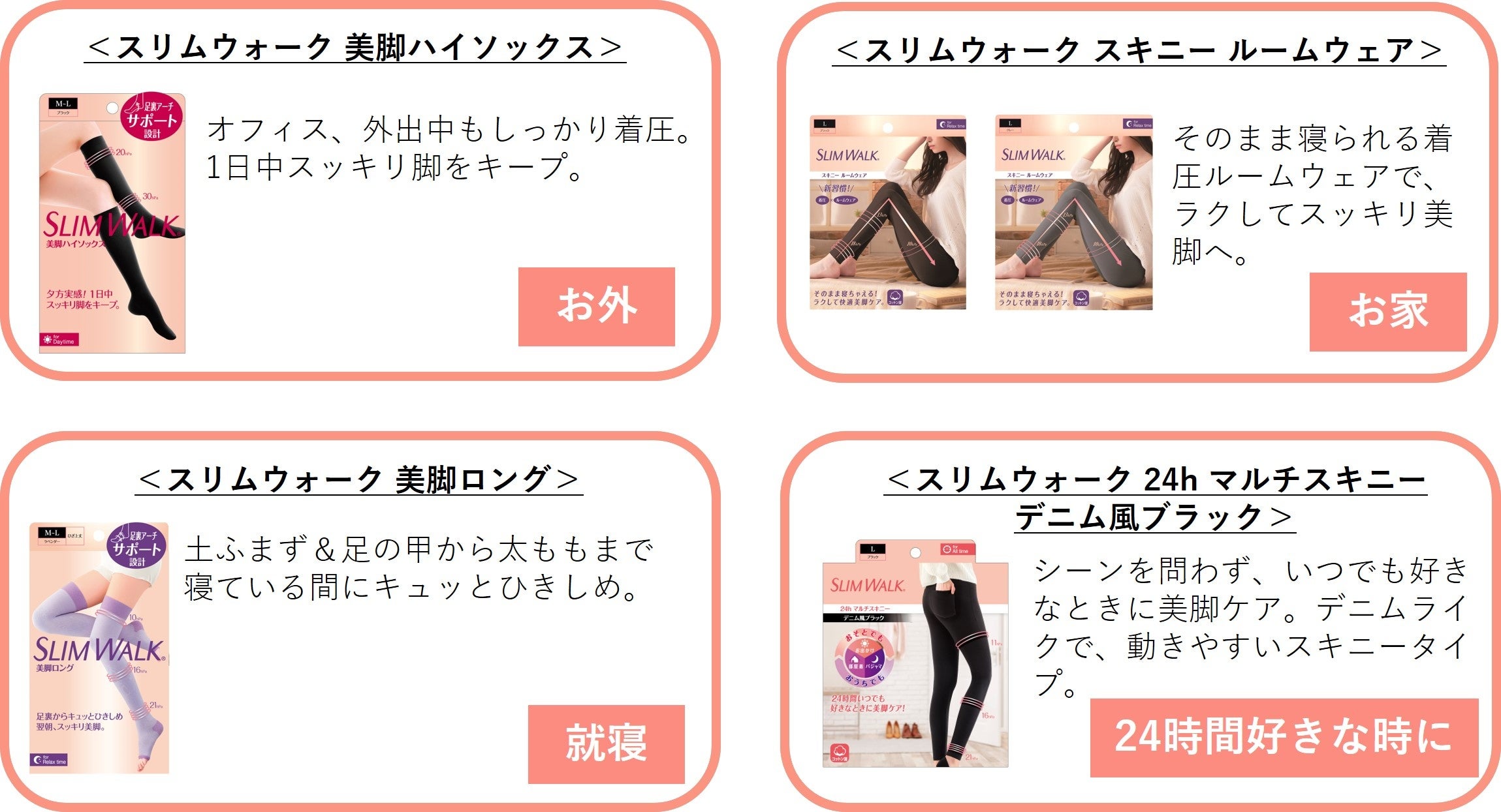 着圧ソックスは、はくだけで「重ダル脚」をスッキリ脚へと導いてくれるお手軽なアイテムです。着圧レッグウェアブランド「スリムウォーク」では、お外、お家、就寝時など、シーンごとに使える約20種類以上の製品を展開しています。