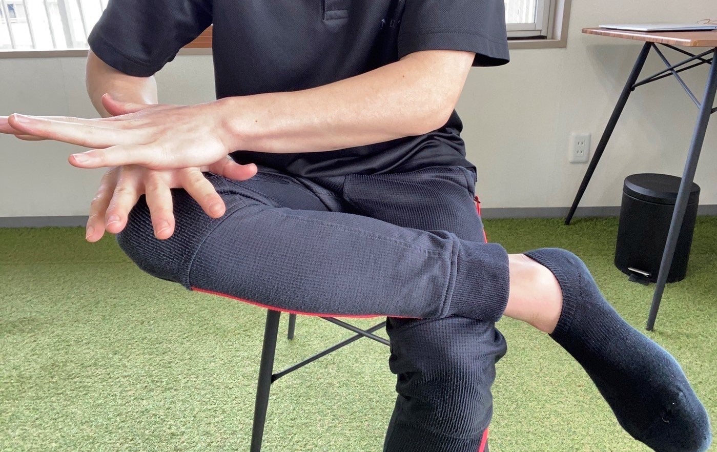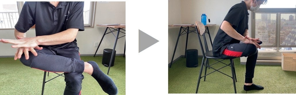 ②ストレッチしたい方の脚のくるぶしを反対側の膝上の外にずらして乗せる