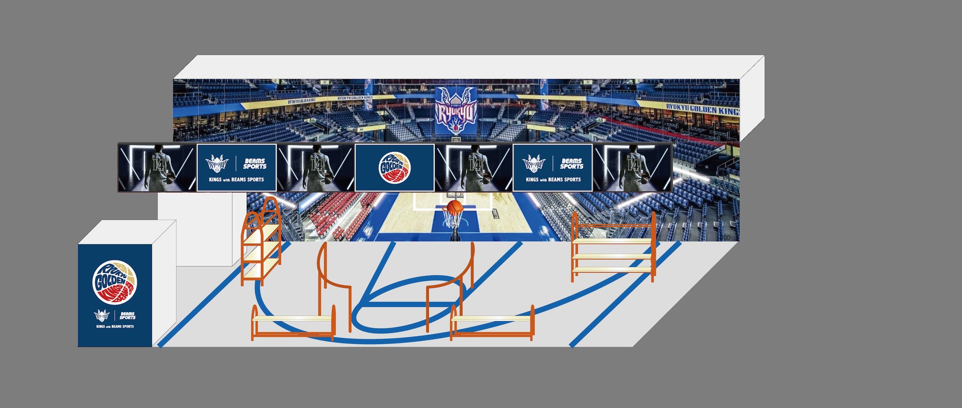 1月10日から展開する「ビームス ニューズ」でのポップアップショップでは、琉球ゴールデンキングスの世界観を融合した仕様に店舗を特別ラッピングします。幅180センチのバスケットゴールを店内に設置し、沖縄アリーナの臨場感を肌で体感できるスペースとなっています。