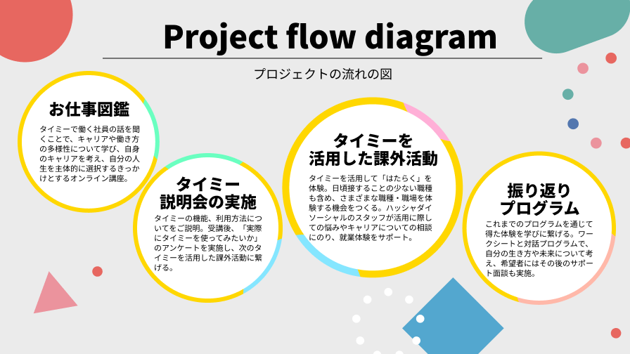 本プロジェクトは、講演活動等を通じて若者のキャリア支援を行うハッシャダイソーシャルとの連携のもと、スポットワークを活用した独自のキャリア教育プログラムを提供することで、高校生の主体的なキャリア選択の支援を行うものです。「業界・業種や働き方についての知識獲得」「多様な就労体験の提供」「自己内省」の3要素を組み合わせた取り組みとなっています。プロジェクト参加の高校生は「はたらく」ことへの理解を深める講義を受講後、夏休み期間を活用しタイミーを通じて、複数の職種・職場での「はたらく」を体験。その後の振り返りを経て職業観を培い、主体的なキャリア選択につなげていきます。