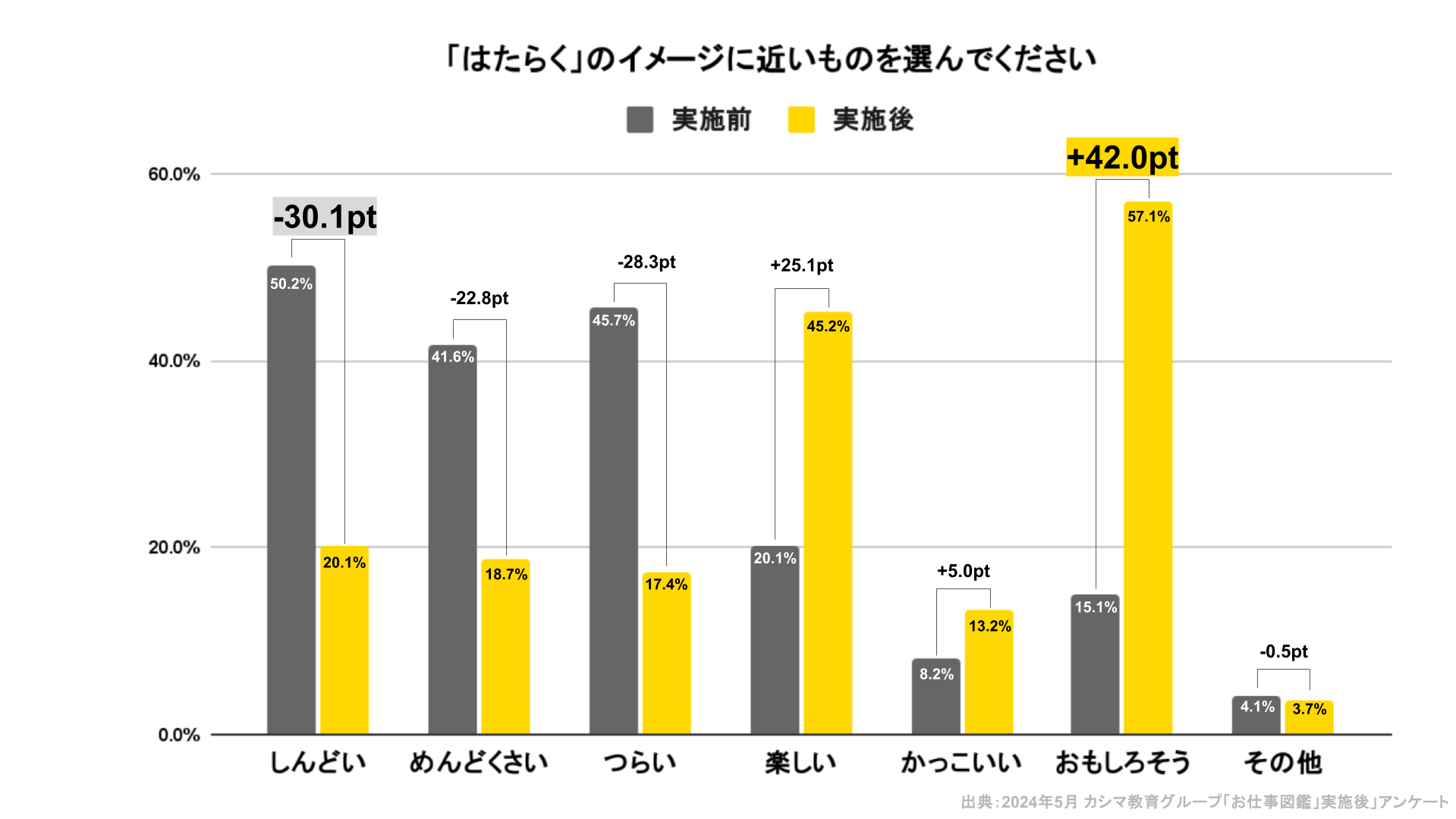 5月29日にカシマ教育グループの高校生219名を対象に実施した「お仕事図鑑」では、弊社所属の社員2名が、自身の仕事における哲学やタイミーで働くことを通じて成し遂げたいことなどをご紹介。実施前後で「はたらく」についてのイメージを「おもしろそう」と回答した生徒の割合は42.0pt増加、「しんどい」と回答した生徒の割合は30.1pt減少しました。