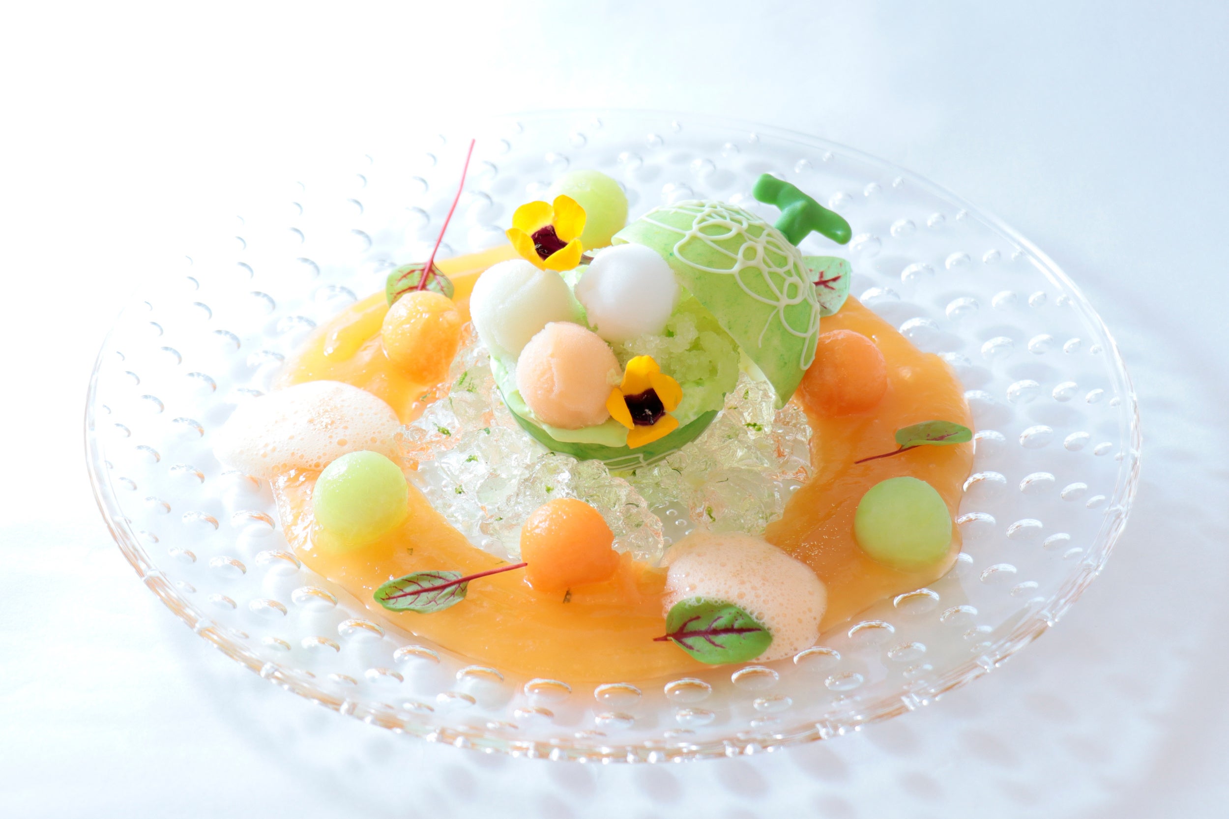 旬のメロンを様々な表現で盛り合わせた夏のデセールです。