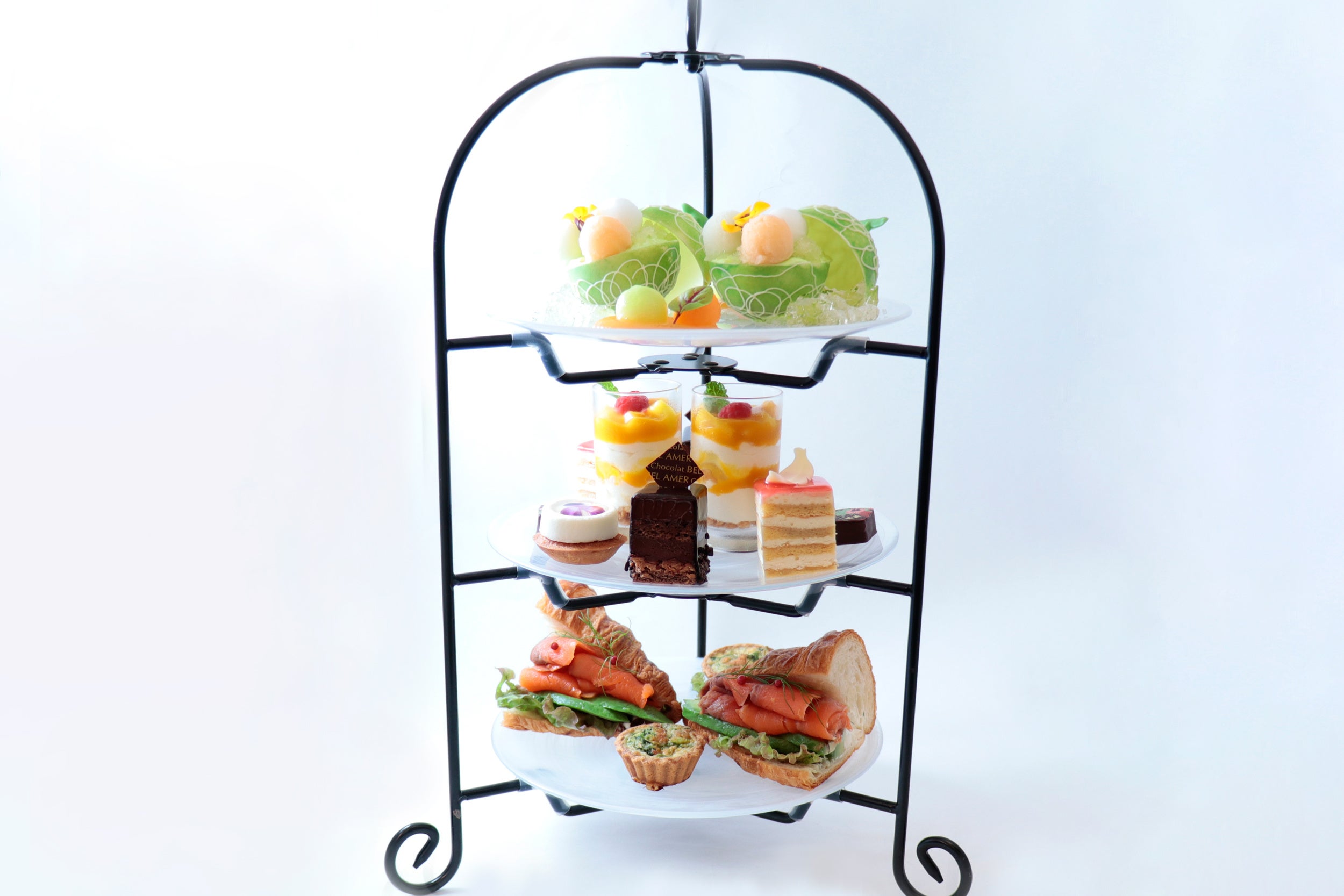 上段には季節のデセール「ショコラメロン」、中段にはショコラノワール、桃のガトー、エルダーフラワーのタルト、マンゴーのヴェリーヌ、ボンボンショコラ、下段にはサンドイッチやミニキッシュを盛り合わせました。