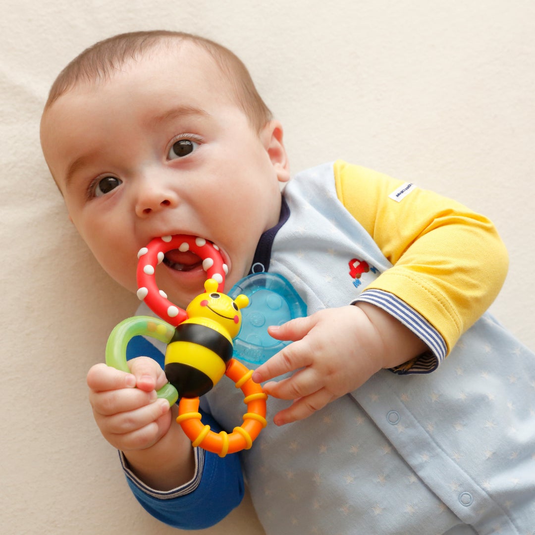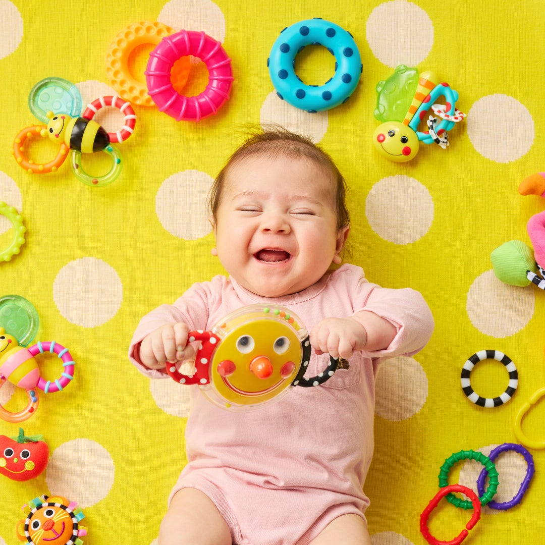 絵本に登場する鮮やかな色や形と、Sassyのロングセラー知育玩具(『カミカミみつばち』など)をセットにすることで、赤ちゃんの健やかな発達を多角的にサポートします。