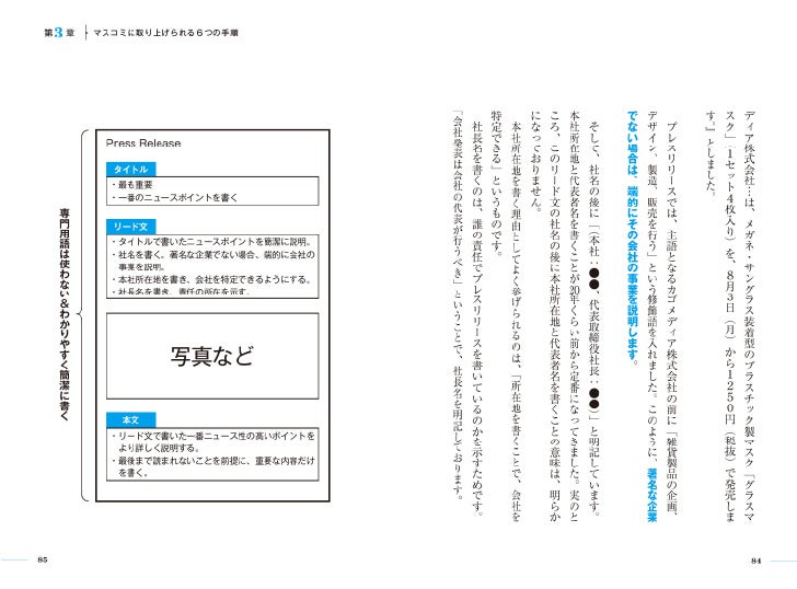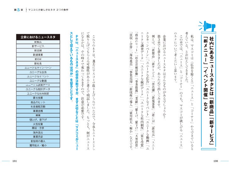マスコミへの情報提供の仕方や電話のかけ方、記者への話し方や訪問アポの取り方まで、豊富な事例を基に詳しく解説。直接社長からマスコミに話してもらうことで取り上げてもらえる可能性を高める方法、マスコミの関心をひく「ニュースネタ」をつくる方法、などすぐに使える実践的な手法が満載です。