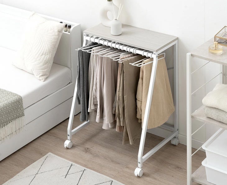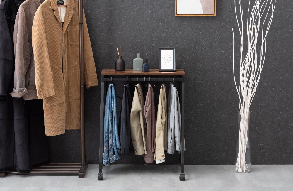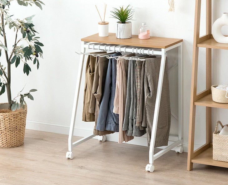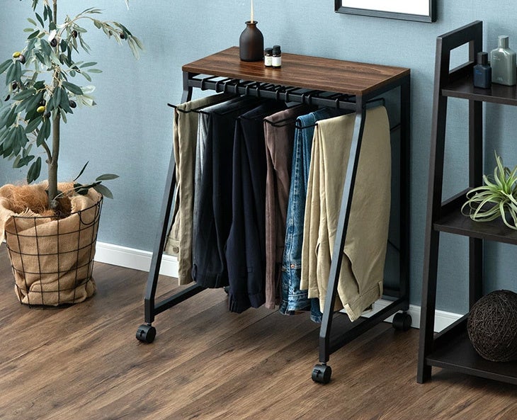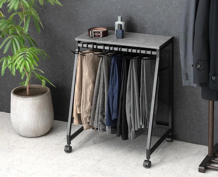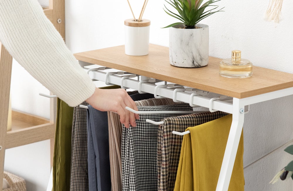 タンスのゲンの『スラックスハンガーラック』は独自設計のS字ハンガーによってハンガー自体を簡単に取り外すことができる製品です。かさばりやすくシワになりやすいズボンやスカートなどを簡単に収納することができます。またスラックスハンガーラックには珍しい天板が付いていることでラック自体のインテリア性が高くなっており見せる収納として使いやすい点も特徴です。