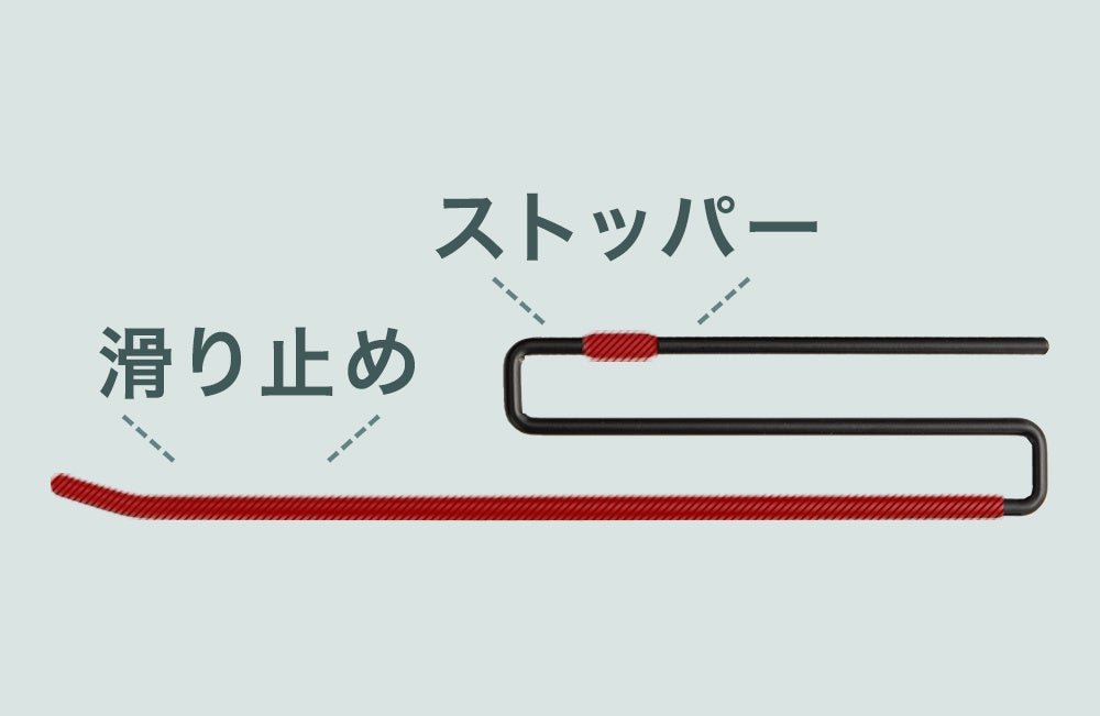 S字ハンガーの衣類を掛ける部分には衣類が滑りにくい素材を採用し、フレームにかける部分にはストッパーを付けることで、意図しないタイミングでハンガーが落下するのを防ぎます。