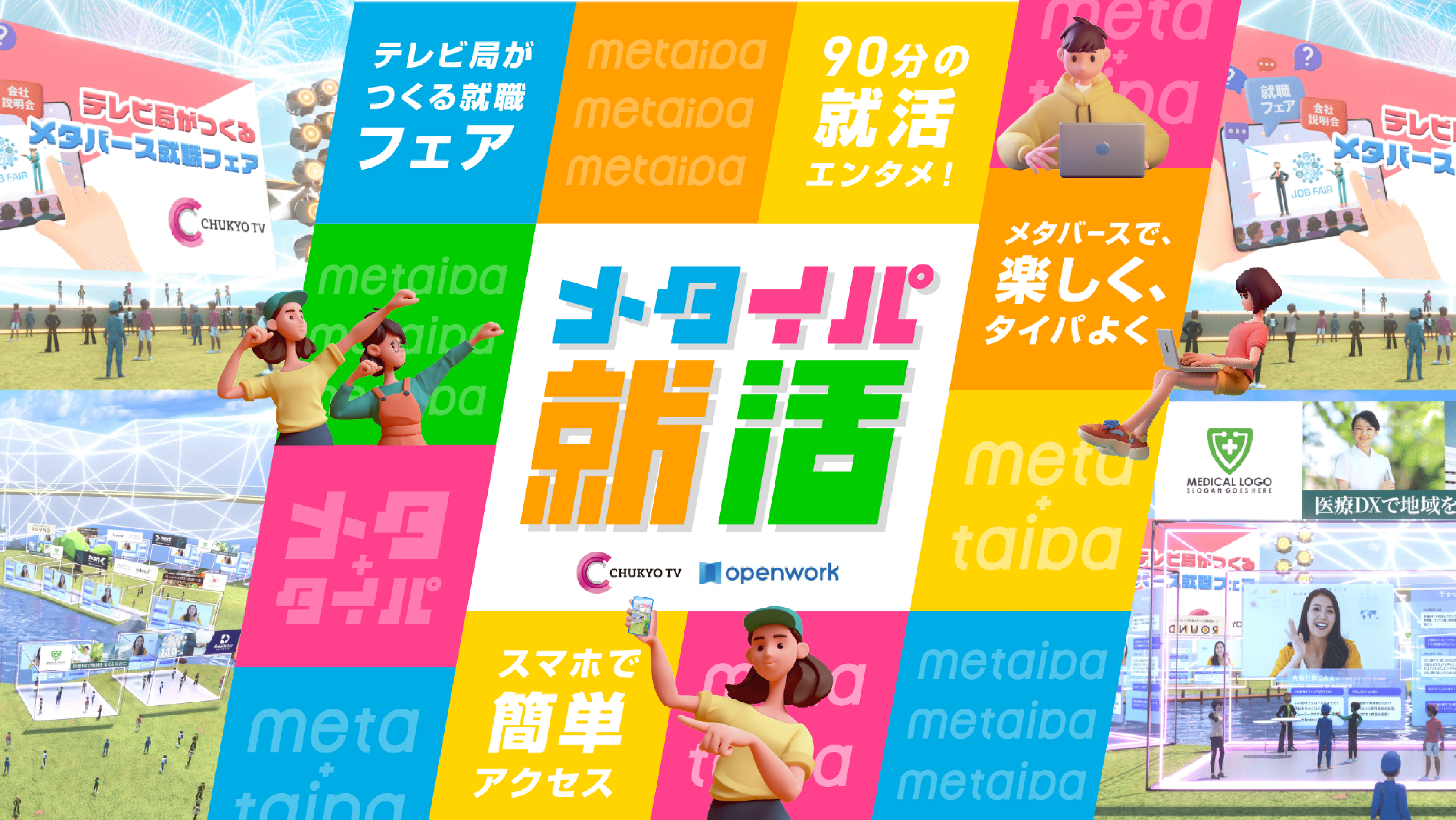 中京テレビ放送株式会社(所在地:愛知県名古屋市中村区 、代表取締役社長:伊豫田 祐司)は、オープンワーク株式会社(所在地:東京都渋谷区、代表取締役:大澤陽樹)の特別協力のもと、若い世代の未来をサポートし、新たなキャリアの扉を開けることを目指して、2023年11月26日(日)にメタバース就職フェア『メタイパ就活』を開催いたします。