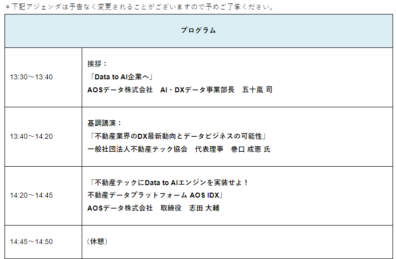 データのライフサイクルマネジメントと品質向上、リスク管理の重要性の啓発を行い、日本のDX推進に貢献するため、AOSデータは各業種ごとの、先進企業のDX推進やAIデータの活用事例、またリスクマネジメント事例などをご紹介する「産業DX/AIデータフォーラム」を企画しており、2023年6月は不動産テック市場で最先端のDXやAIを活用した事業を推進されている各社様にご登壇いただきお届けします。