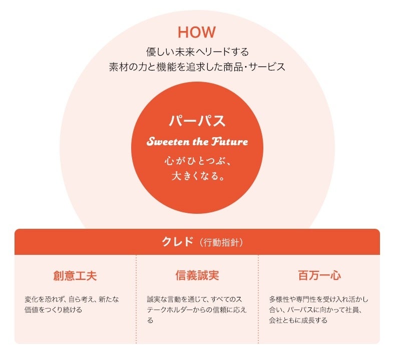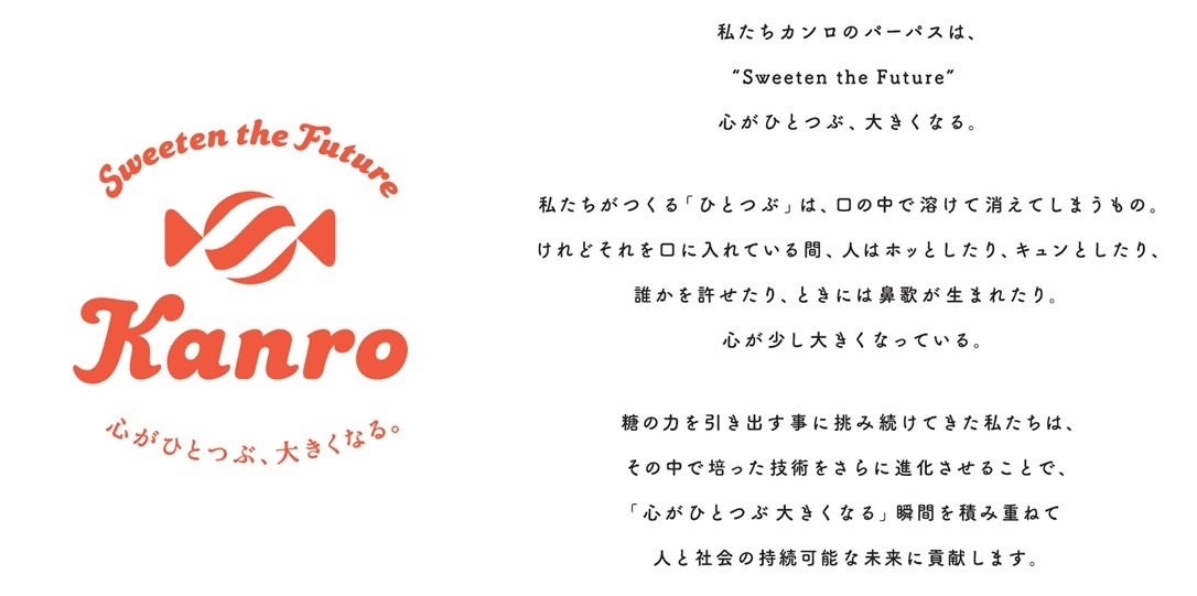 2022年度、カンロでは「KanroVision2030」を元に、変化が激しく、先行きが不透明・不確実な時代の中、カンロがこれまで歩んできた道程を確認の上、自分たちの未来への想いを言語化し、企業パーパス「Sweeten the Future ~心がひとつぶ、大きくなる。~」を定めました。糖から未来をつくり、糖の力を引き出す事に挑み続けてきたカンロが企業活動の中で培った技術をさらに進化させることで、 「心がひとつぶ大きくなる」瞬間を積み重ねて人と社会の持続可能な未来に貢献してまいります。