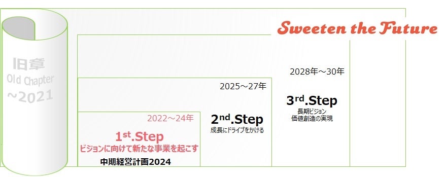 カンロは、企業パーパス「Sweeten the Future ~心がひとつぶ、大きくなる。~」を起点に「Kanro Vision 2030」の実現に向けて、2022年からNew Chapter(新章)をスタートさせます。ファーストステップとなる2022年度12月期から2024年12月期までの3ヶ年を対象とする「中期経営計画2024」は、ビジョン実現に向けて新たな事業を起こしてまいります。