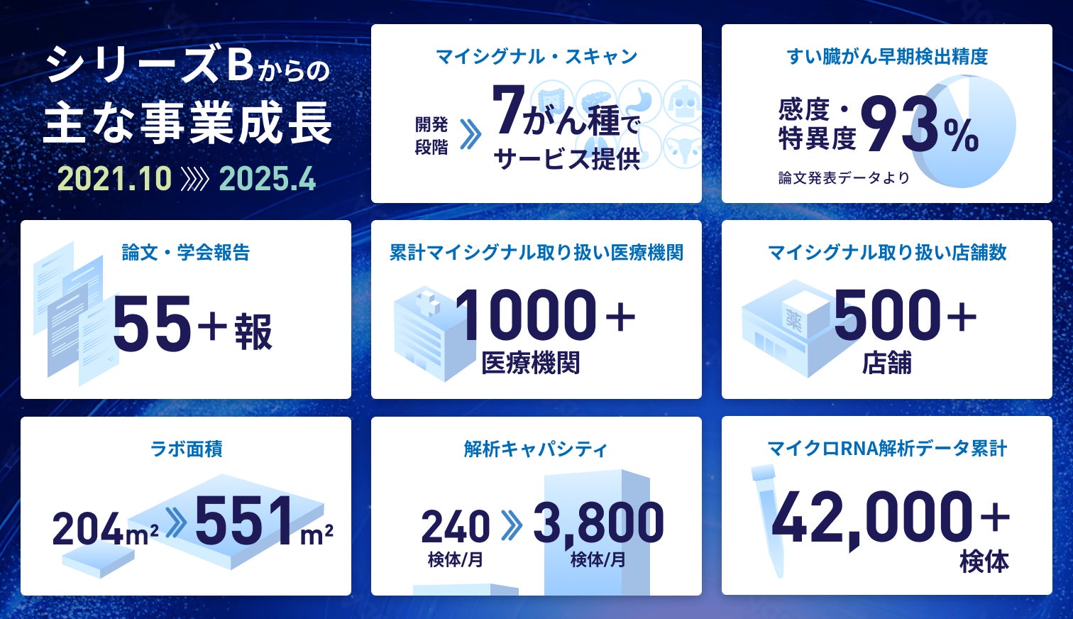 2021年10月のシリーズB資金調達時には「マイシグナル・スキャン」は開発段階でしたが、2022年2月のサービス開始後、全国1,000超の医療機関、500店舗超のドラッグストア・薬局に導入され、さらに企業の福利厚生プログラムやECチャネルを通じて急速にサービスを拡大しています。研究開発も含め、これまでに蓄積した検体データは4.2万件を超え、その研究成果を約60件の学術論文や学会報告として公表してきました。直近では、権威ある医学誌Lancet系列の「eClinicalMedicine」において、すい臓がんの早期かつ高精度な検出に関する成果を報告しています。また、管轄自治体の許可を取得して運営している衛生検査所は、その面積を従来の2倍に拡張し、解析能力も従来比で15倍以上に増強しました。さらに2024年4月には、すい臓がん診断を目的とする医療機器プログラムの薬事承認取得を目指した臨床試験を開始いたしました。