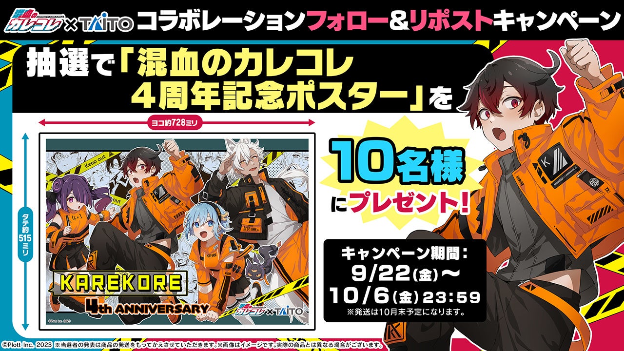 期間中、タイクレの公式アカウント(@Taito_Olcrane)をフォロー、および該当キャンペーン投稿をリポストいただくと、抽選で「混血のカレコレ4周年記念ポスター」を10名様にプレゼントいたします。