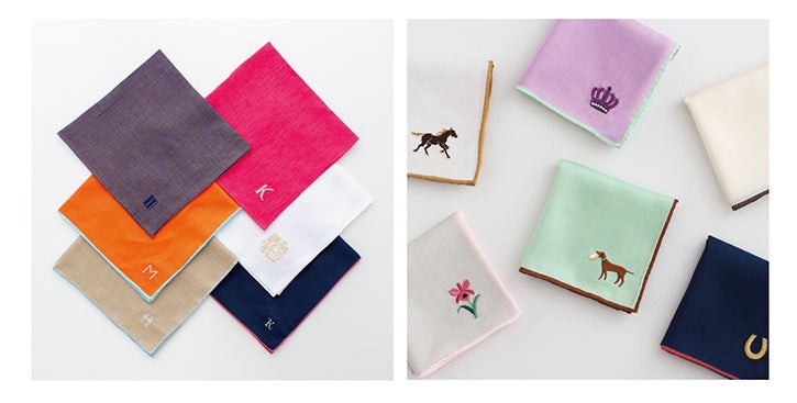 △イニシャル刺繍やモチーフ刺繍の無料券もご用意!イニシャル刺繍は、33書体・20色の糸色からお選びいただけます。他では見つけることのできないオリジナルデザインの刺繍で、特別なハンカチーフをお作りいただけます。