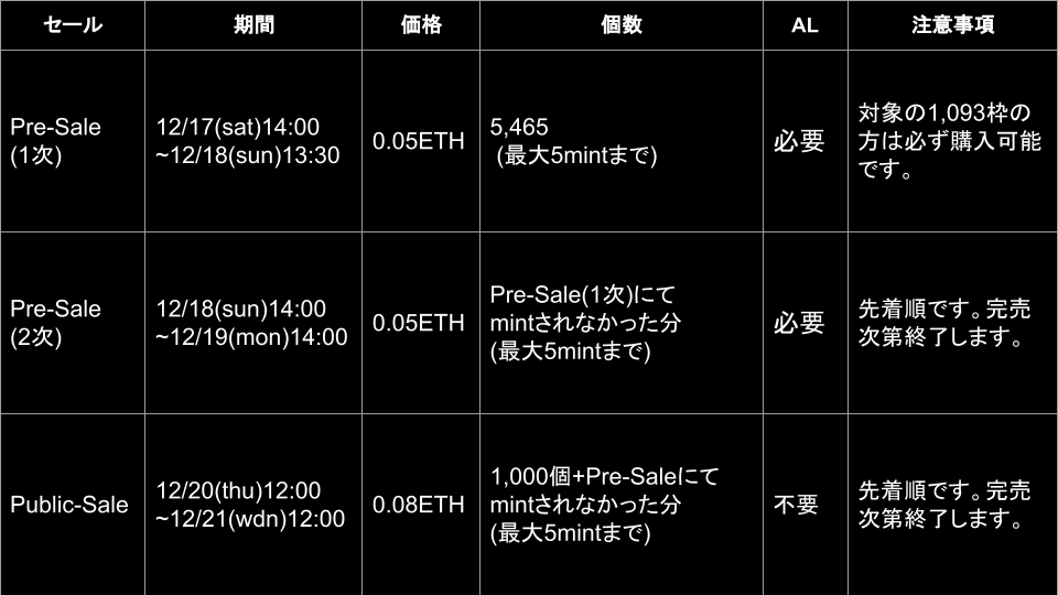 個数:1,000個+Minting siteでのPre-Saleで完売しなかった分(Mint上限無し/1回当たりのMint上限数5個)