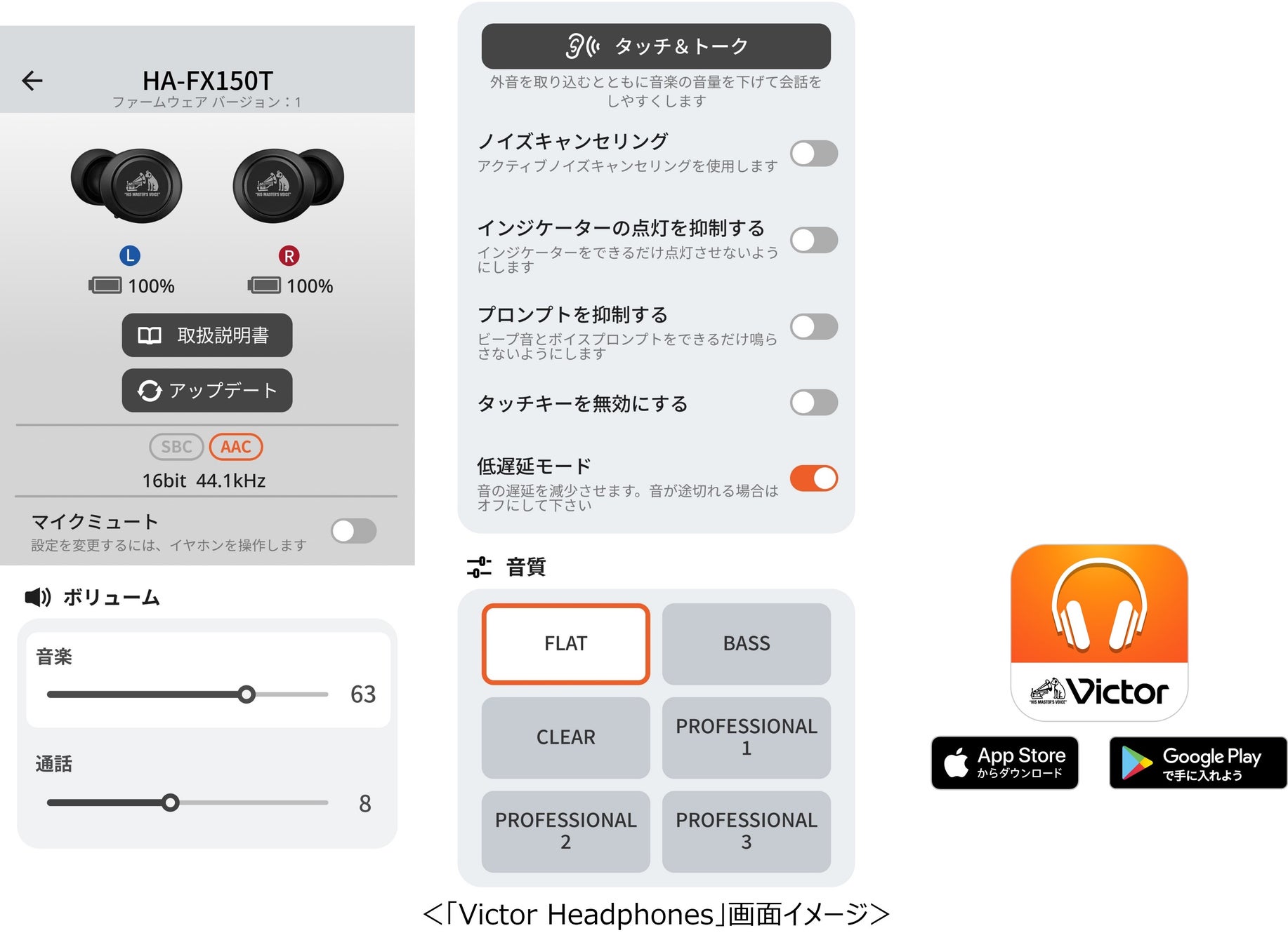 専用アプリ「Victor Headphones」に対応し、サウンドモードの切り替え、機能の設定・切り替え、音量操作が可能です。また今後、各種機能をアップデートにより追加していく予定です。