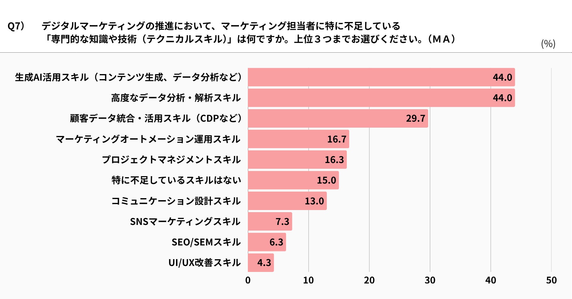 経営層が考えるマーケティング担当者の不足スキルは「生成AI活用(44.0%)」「高度データ分析(44.0%)」「顧客データ統合・活用(29.7%)」