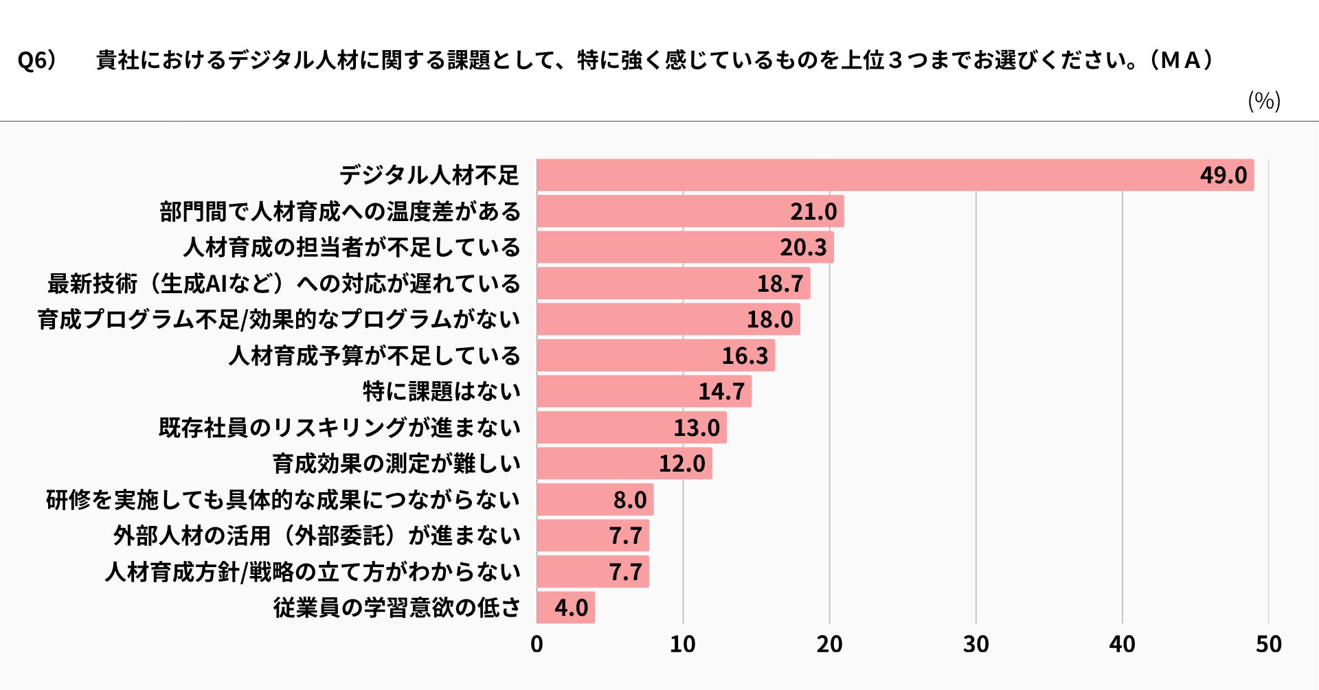 デジタル人材育成に対する数値目標を掲げ、評価などを可視化できている企業は3割弱です。「数値目標は設定しているが評価は難しい/数値での評価ができていない(29.7%)」を加えると、約7割の企業では、デジタル人材育成に対する費用対効果が可視化されていません(Q5)。