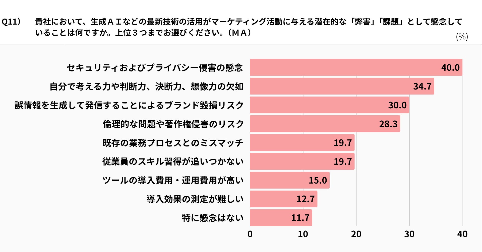 生成AIの活用がマーケティング活動に与える弊害・課題については、複数回答で「セキュリティおよびプライバシー侵害の懸念(40.0%)」が最多でした。「自分で考える力や判断力、決断力、想像力の欠如(34.7%)」「誤情報生成によるブランド毀損リスク(30.0%)」「倫理的問題や著作権侵害のリスク(28.3%)」が続きます。セキュリティや信頼性の問題は生成AI登場以降指摘されてきましたが、最近では「AI活用による思考力の低下」リスクも懸念されていることがうかがえます(Q11)。