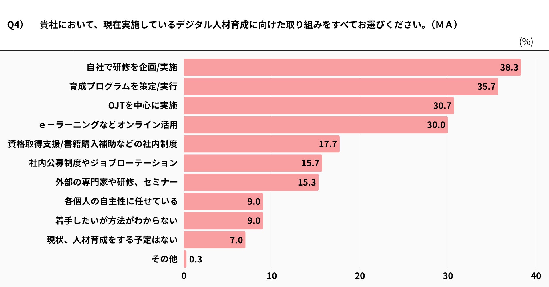 現在実施しているデジタル人材育成については、複数回答で「自社で研修を企画・実施(38.3%)」「育成プログラムを策定・実行(35.7%)」「OJTを中心に実施(30.7%)」「eラーニングなどオンライン活用(30.0%)」と、自社内での取り組みが比較的多く見られました(Q4)。
