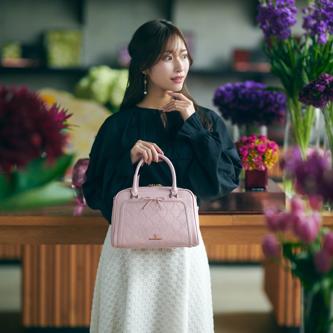 リボンモチーフの型押し総柄をメインに、立体的なリボンがポイント。
