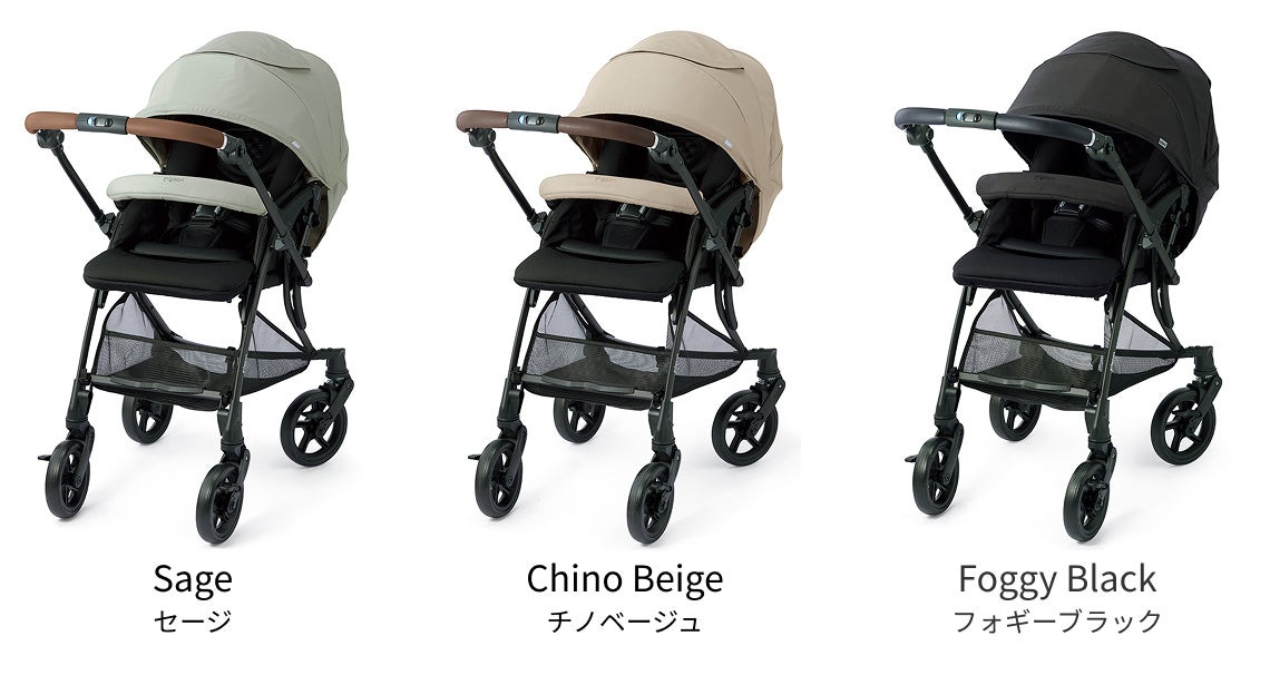 今作の「Runfee Lino’n9」は、タイヤの回転をより滑らかにするため、従来のキャスター軸に加え、新たにすべての車軸にもボールベアリングを導入。ベアリング搭載箇所を増設したことで、これまで以上に軽い力でスムーズに進む「押しやすさ」を実現しました。さらに、片手で瞬時に背もたれの角度が調節できる「レバー式リクライニング」(※2)を採用し、忙しいお出かけ時の操作性を進化させました。デザイン面では、日常の装いに自然に馴染むニュアンスカラーと、高級感のあるピーチスキン生地の幌により、自分らしいライフスタイルに寄り添い、毎日のお出かけがさらに楽しみになるデザインへと進化しました。