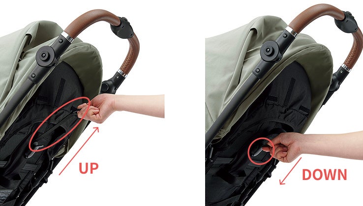従来の紐引き方式から、片手で背もたれの角度を調節できるレバー式へ刷新しました。お出かけ中に赤ちゃんが寝ているときも、片手でレバーを引くだけでお好みの角度にサッと調節できるため、赤ちゃんを乗せたまま、眠りを妨げることなく静かに寝かせてあげることが可能です。