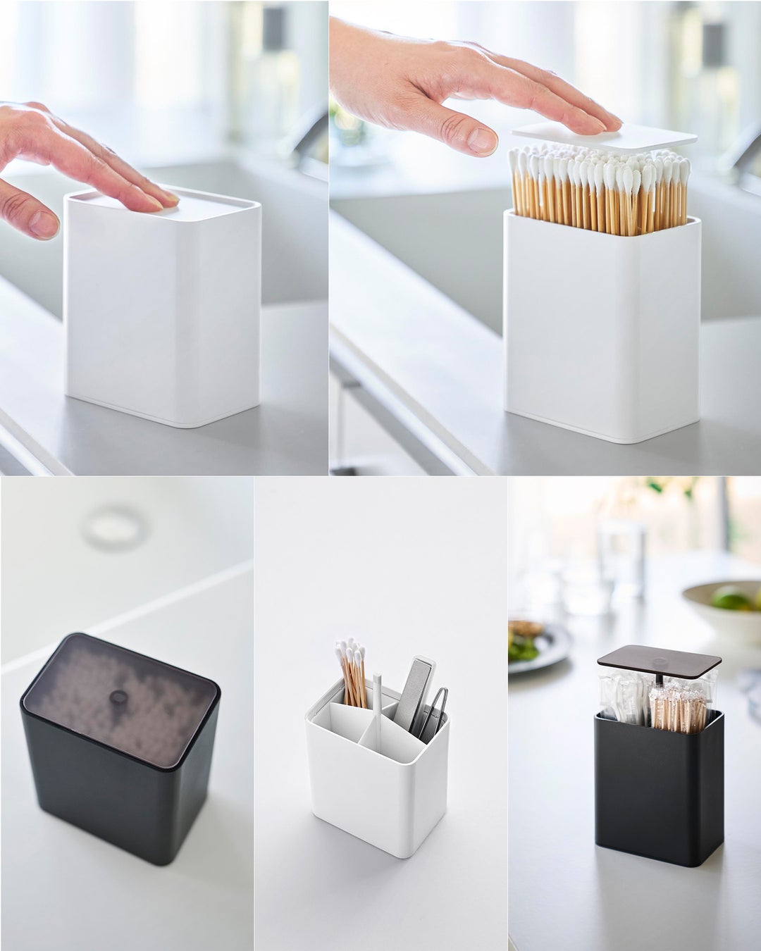 蓋を押すだけの簡単開閉で、綿棒が取り出しやすいポップアップ式のケースです。