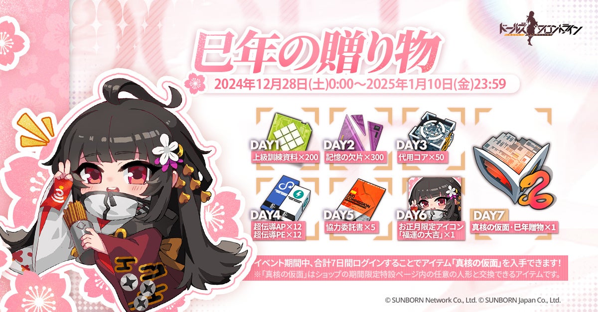 累計7日間ログインすると、毎日報酬が獲得できる上に指定の★5人形の中から好きな1体を選んで交換できるアイテム「真核の仮面·巳年贈物×1」も入手できるイベントです。